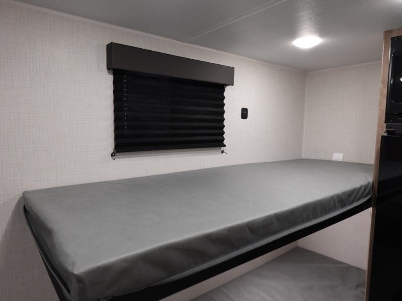 This lightweight travel trailer is perfect for four happy campers. You'll enjoy the front full-size bed, while your guests or little ones take the 28" x 74" bunk beds. There is also a shelf above the bed to keep your things organized. A private bath includes a shower with a toilet so you can freshen up each day without having to leave your camper. You can make your meals on the two burner gas cooktop or in the microwave oven, then take your plate outdoors to eat under the 8' power awning!