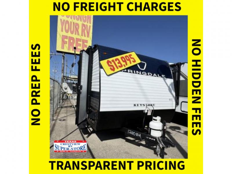 With any Springdale Mini travel trailer by Keystone, you will enjoy lightweight towing thanks to their single-axle! The AlphaPly TPO roof membrane is ultra durable, and the power awning will provide protection from the sun as you relax in your camp chairs outside. Each model includes blackout night shades, LED lighting, plus many more interior comforts. There is also a roof A/C and 20K BTU furnace to keep you comfortable, plus a tankless water heater for endless hot showers!