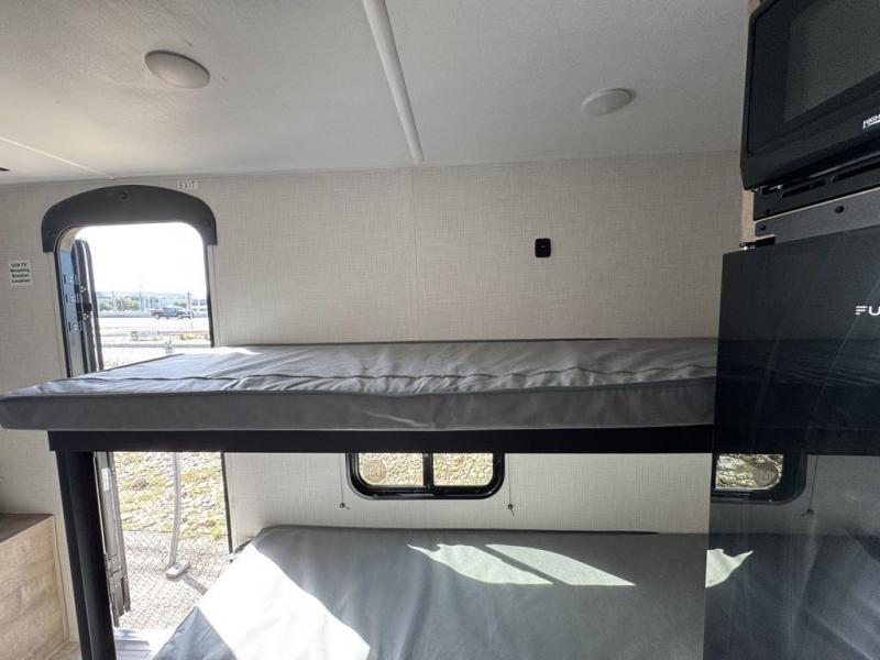 This lightweight travel trailer is perfect for four happy campers. You'll enjoy the front full-size bed, while your guests or little ones take the 28" x 74" bunk beds. There is also a shelf above the bed to keep your things organized. A private bath includes a shower with a toilet so you can freshen up each day without having to leave your camper. You can make your meals on the two burner gas cooktop or in the microwave oven, then take your plate outdoors to eat under the 8' power awning!