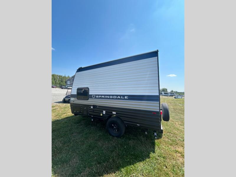 With any Springdale Mini travel trailer by Keystone, you will enjoy lightweight towing thanks to their single-axle! The AlphaPly TPO roof membrane is ultra durable, and the power awning will provide protection from the sun as you relax in your camp chairs outside. Each model includes blackout night shades, LED lighting, plus many more interior comforts. There is also a roof A/C and 20K BTU furnace to keep you comfortable, plus a tankless water heater for endless hot showers!