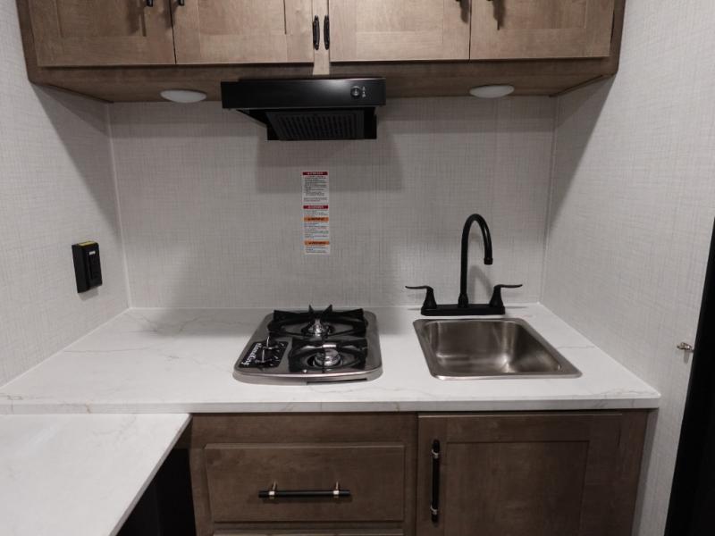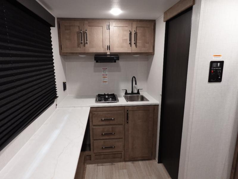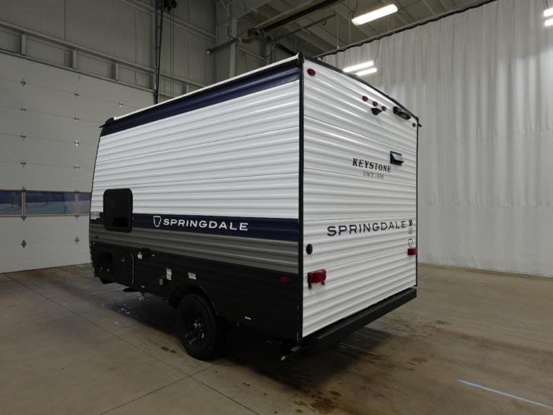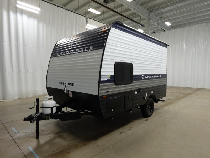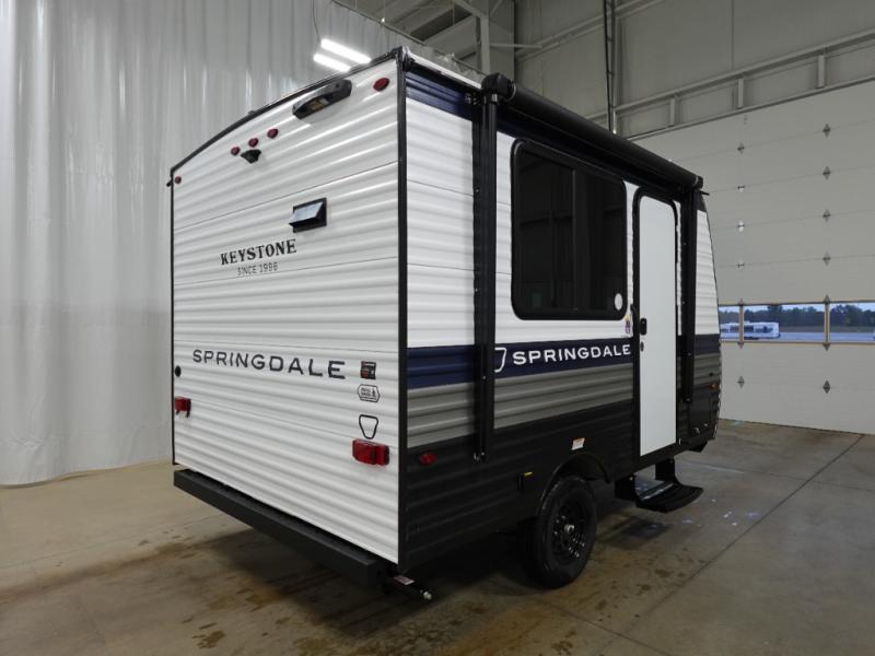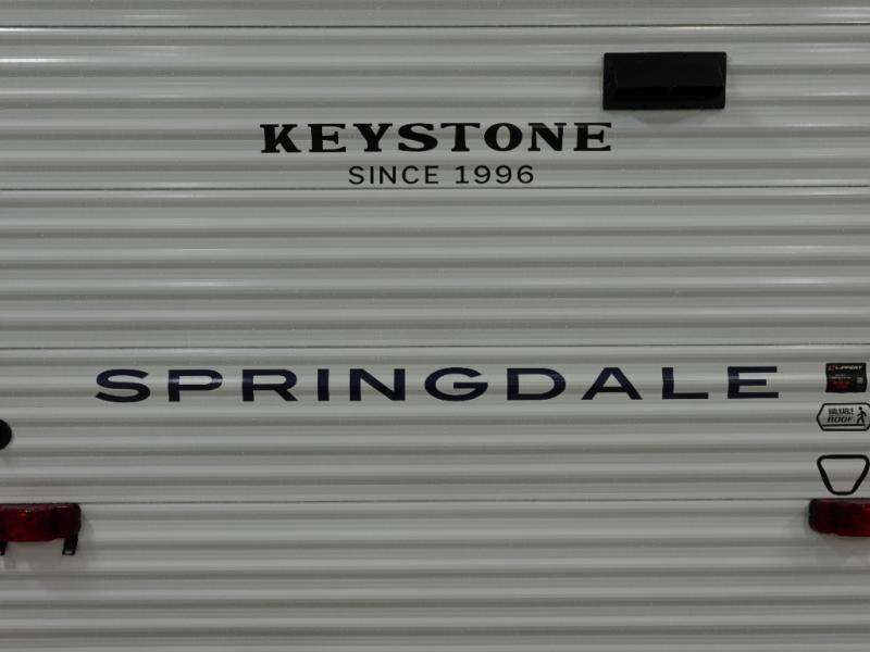 With any Springdale Mini travel trailer by Keystone, you will enjoy lightweight towing thanks to their single-axle! The AlphaPly TPO roof membrane is ultra durable, and the power awning will provide protection from the sun as you relax in your camp chairs outside. Each model includes blackout night shades, LED lighting, plus many more interior comforts. There is also a roof A/C and 20K BTU furnace to keep you comfortable, plus a tankless water heater for endless hot showers!