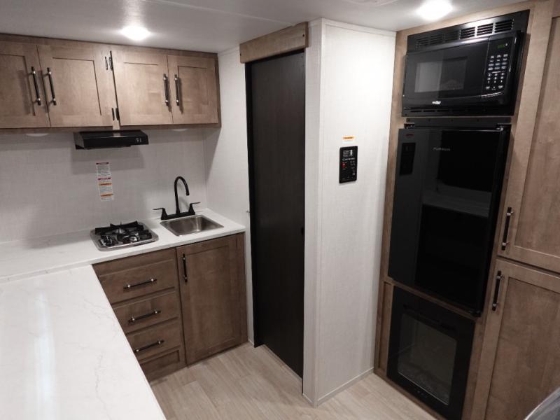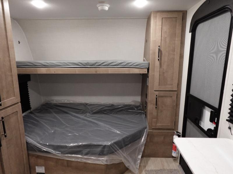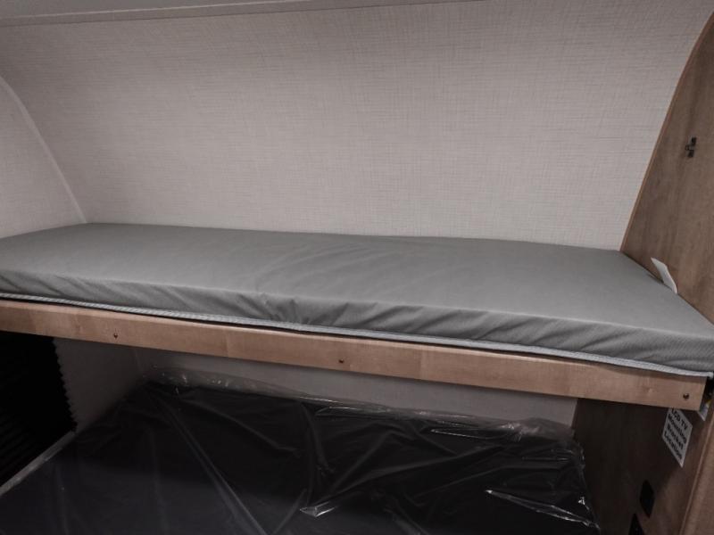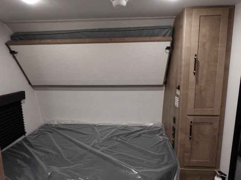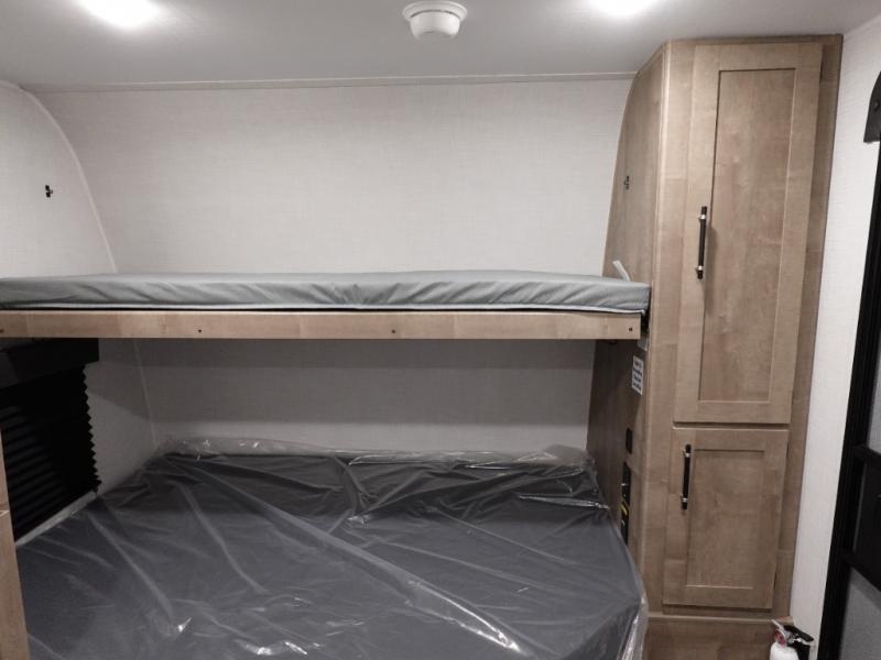 Your small crew will love camping in this lightweight travel trailer. There is a full-size bed up front with a folding bunk above plus a closet at the foot of the bed to keep your things out of the way. The two burner gas cooktop and microwave oven will let you make breakfast in the morning, and the folding table with two chairs provides a place to dine together. And a private bath with a shower and toilet lets you easily clean up after a day outdoors!