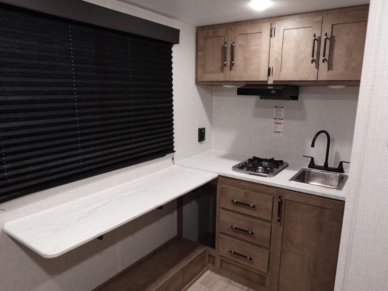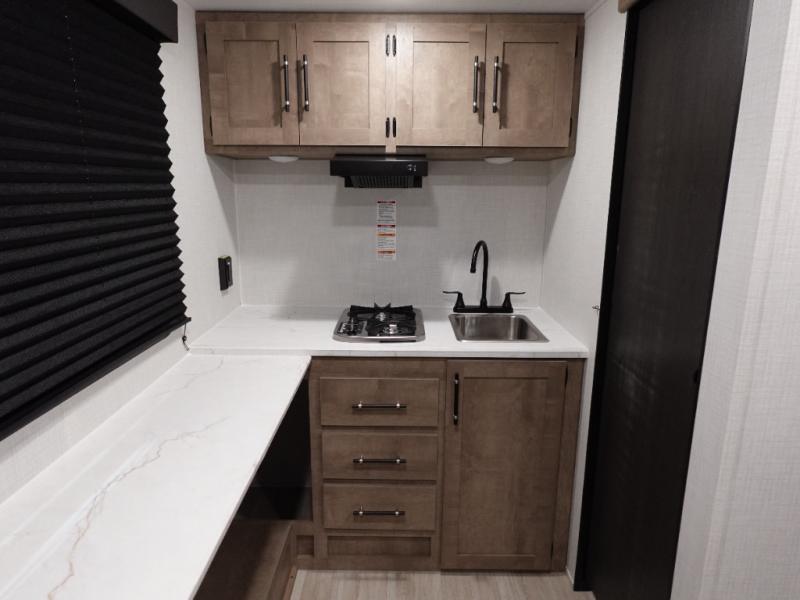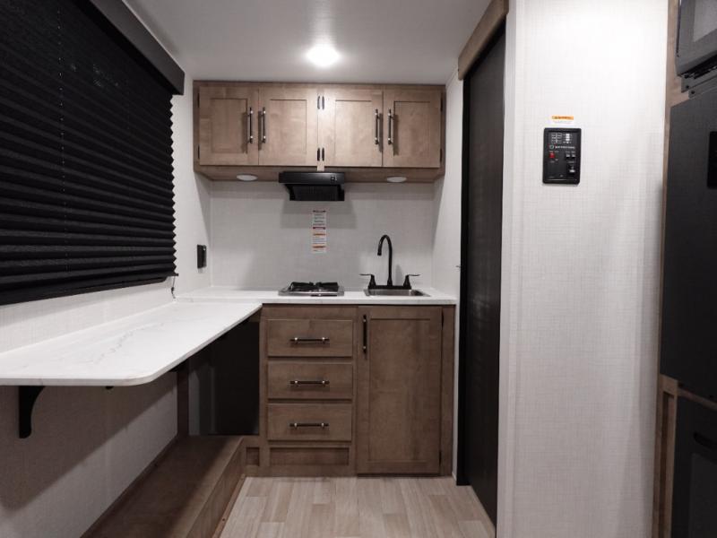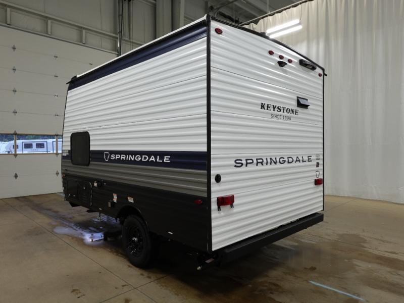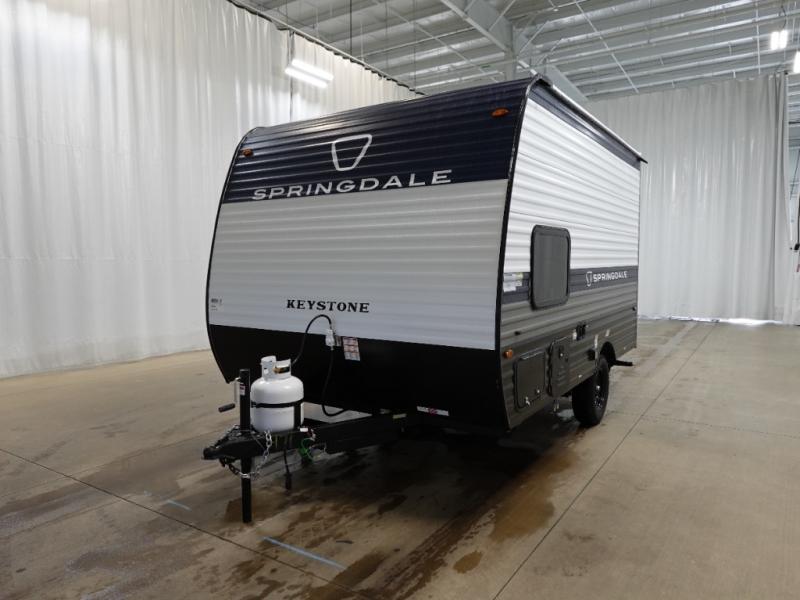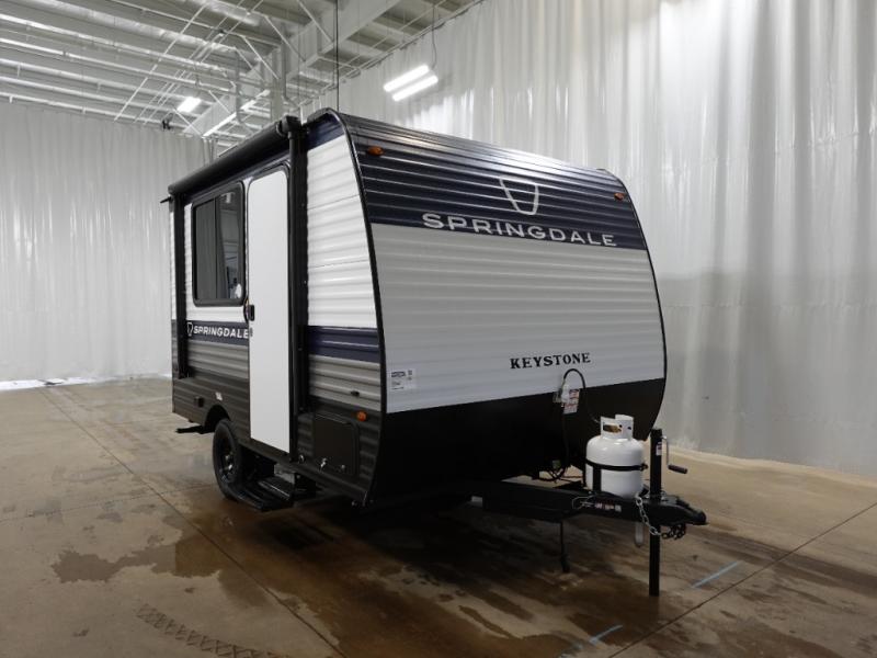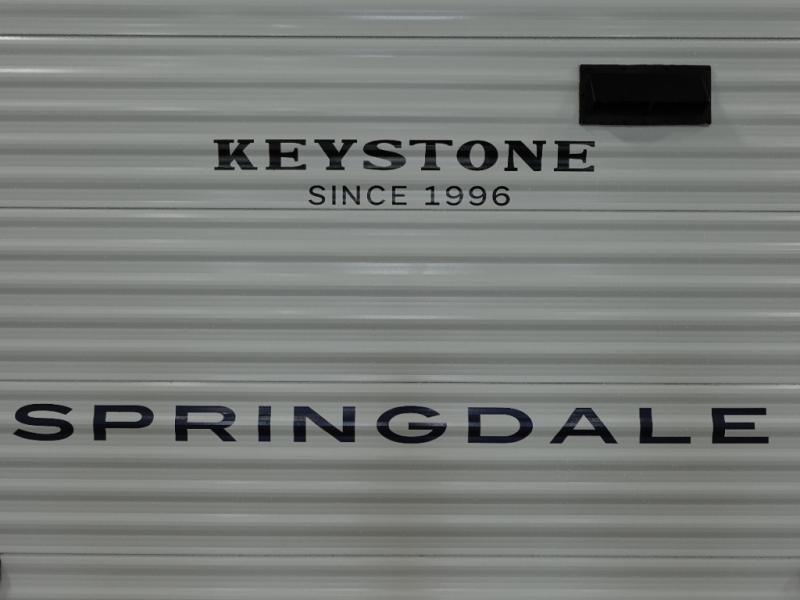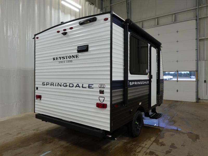With any Springdale Mini travel trailer by Keystone, you will enjoy lightweight towing thanks to their single-axle! The AlphaPly TPO roof membrane is ultra durable, and the power awning will provide protection from the sun as you relax in your camp chairs outside. Each model includes blackout night shades, LED lighting, plus many more interior comforts. There is also a roof A/C and 20K BTU furnace to keep you comfortable, plus a tankless water heater for endless hot showers!