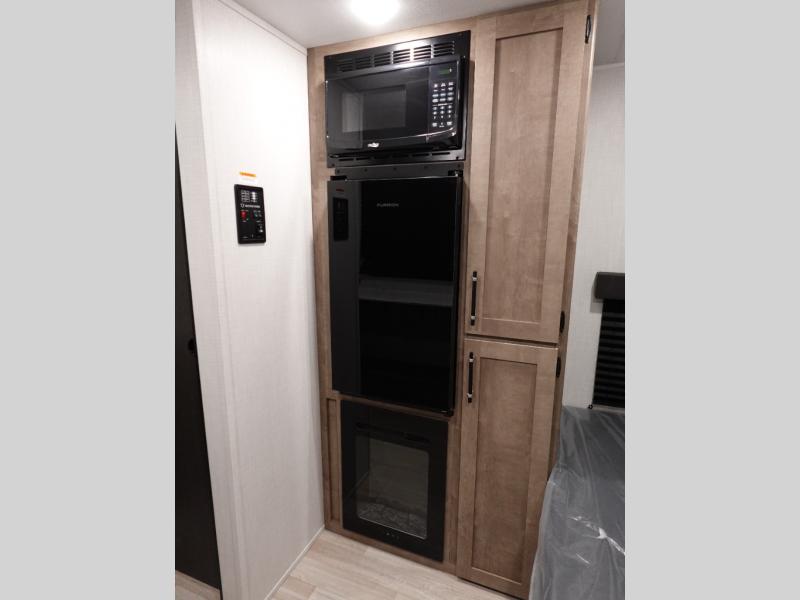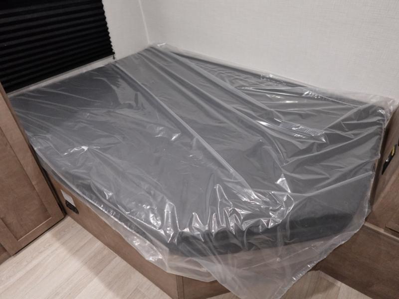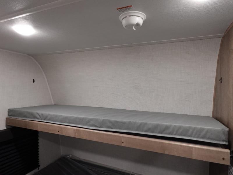 Your small crew will love camping in this lightweight travel trailer. There is a full-size bed up front with a folding bunk above plus a closet at the foot of the bed to keep your things out of the way. The two burner gas cooktop and microwave oven will let you make breakfast in the morning, and the folding table with two chairs provides a place to dine together. And a private bath with a shower and toilet lets you easily clean up after a day outdoors!