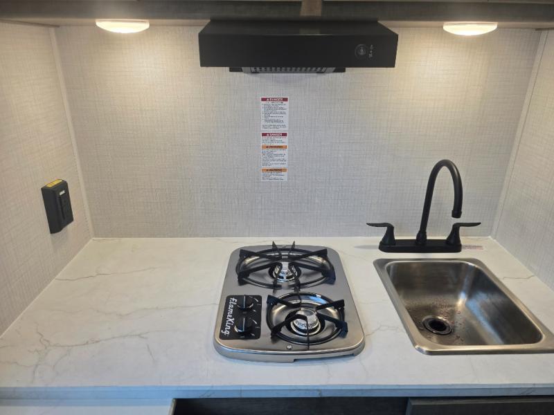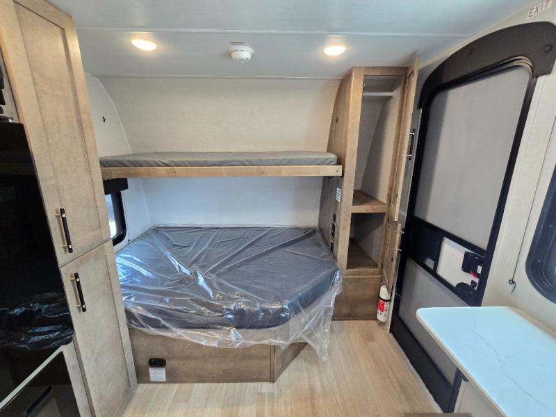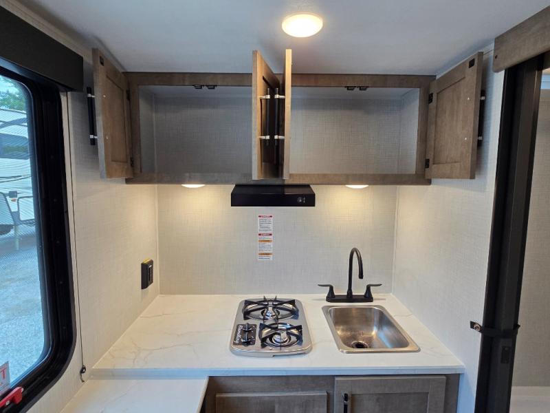 Your small crew will love camping in this lightweight travel trailer. There is a full-size bed up front with a folding bunk above plus a closet at the foot of the bed to keep your things out of the way. The two burner gas cooktop and microwave oven will let you make breakfast in the morning, and the folding table with two chairs provides a place to dine together. And a private bath with a shower and toilet lets you easily clean up after a day outdoors!