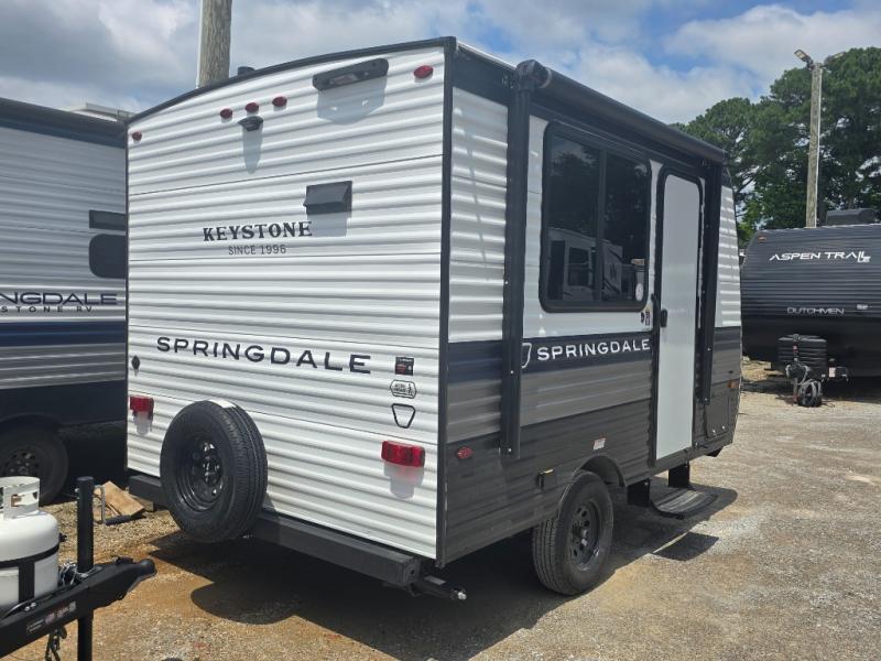 With any Springdale Mini travel trailer by Keystone, you will enjoy lightweight towing thanks to their single-axle! The AlphaPly TPO roof membrane is ultra durable, and the power awning will provide protection from the sun as you relax in your camp chairs outside. Each model includes blackout night shades, LED lighting, plus many more interior comforts. There is also a roof A/C and 20K BTU furnace to keep you comfortable, plus a tankless water heater for endless hot showers!