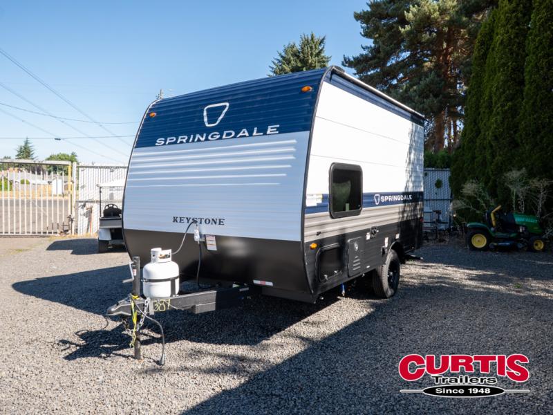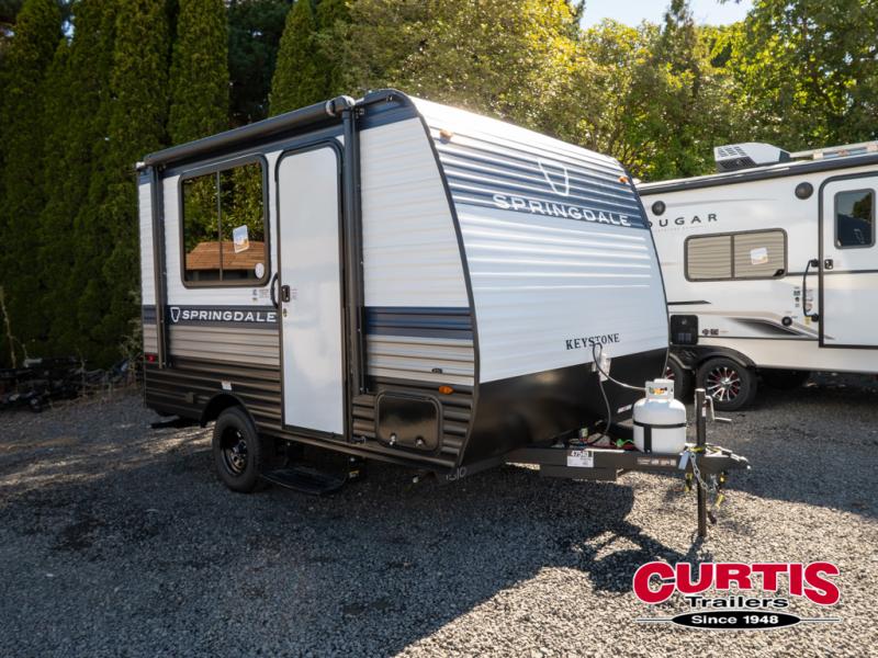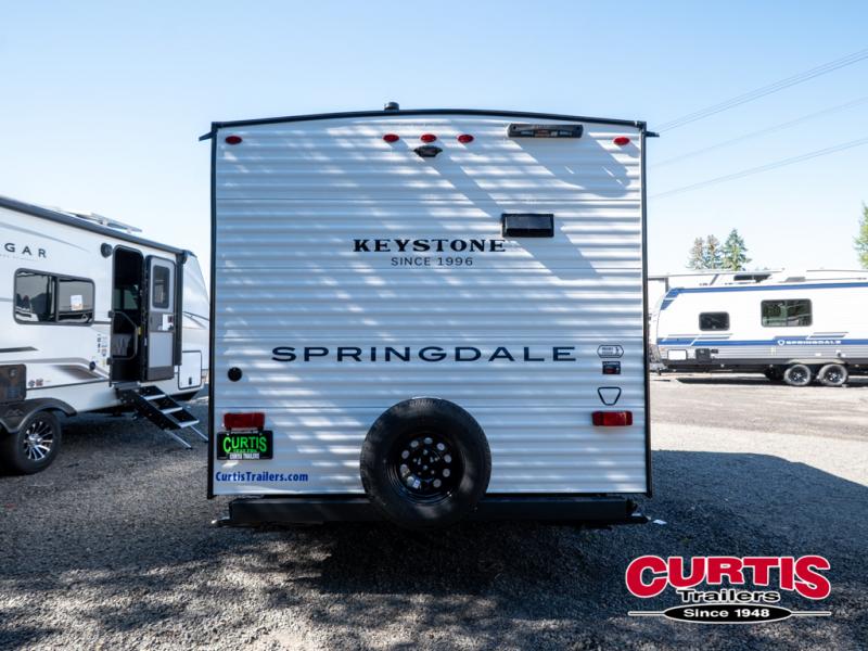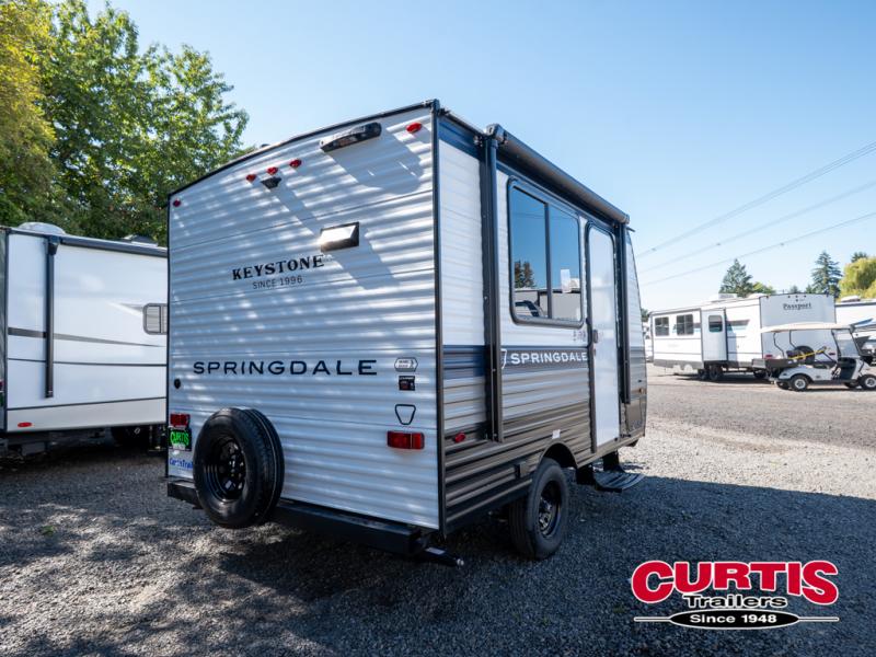 With any Springdale Mini travel trailer by Keystone, you will enjoy lightweight towing thanks to their single-axle! The AlphaPly TPO roof membrane is ultra durable, and the power awning will provide protection from the sun as you relax in your camp chairs outside. Each model includes blackout night shades, LED lighting, plus many more interior comforts. There is also a roof A/C and 20K BTU furnace to keep you comfortable, plus a tankless water heater for endless hot showers!