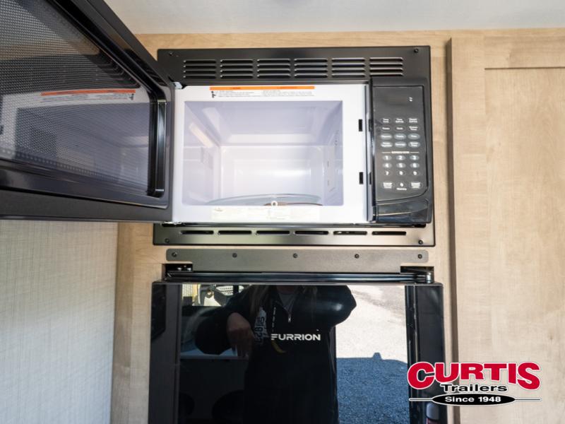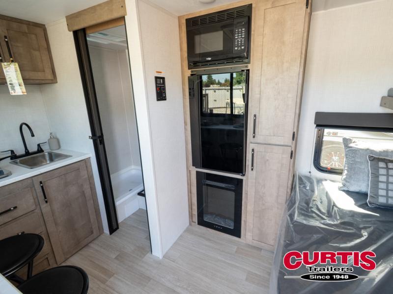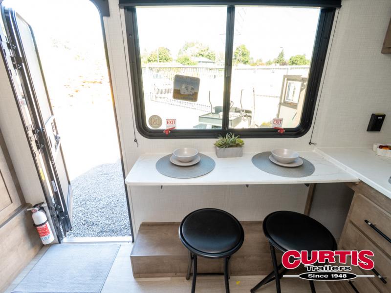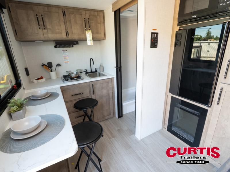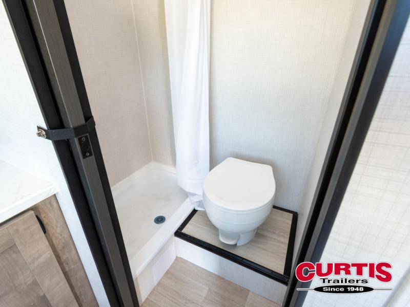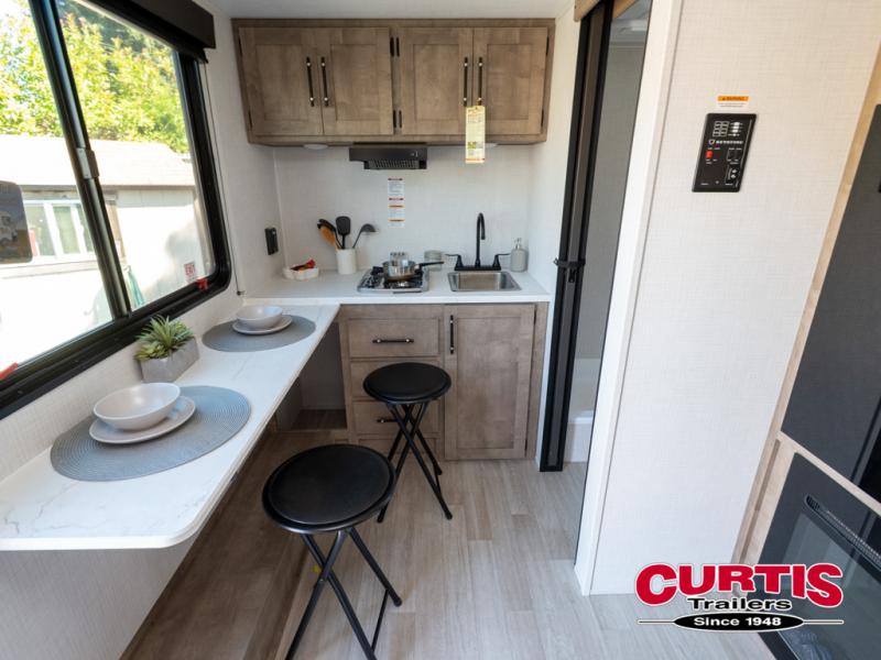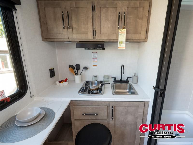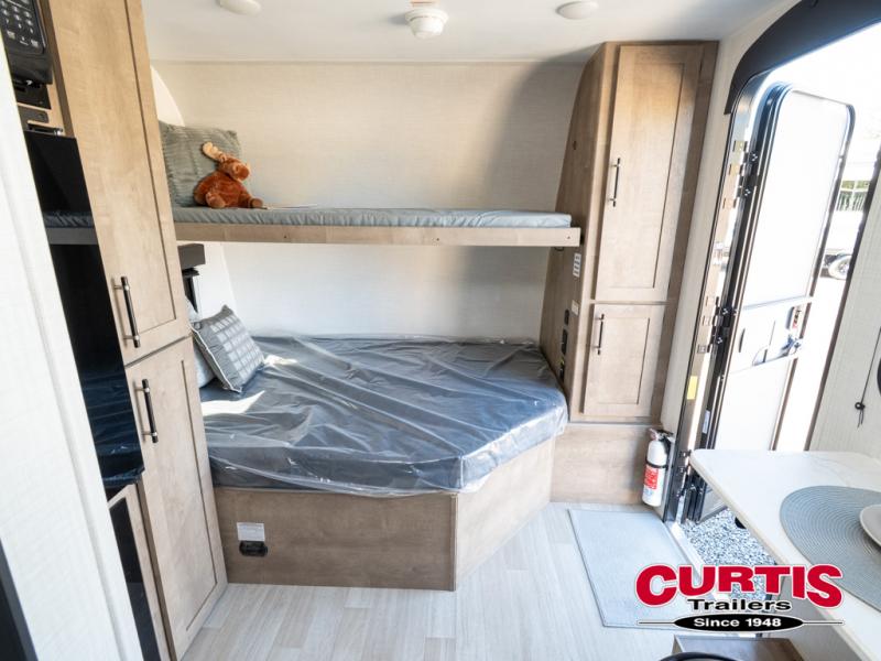 Your small crew will love camping in this lightweight travel trailer. There is a full-size bed up front with a folding bunk above plus a closet at the foot of the bed to keep your things out of the way. The two burner gas cooktop and microwave oven will let you make breakfast in the morning, and the folding table with two chairs provides a place to dine together. And a private bath with a shower and toilet lets you easily clean up after a day outdoors!