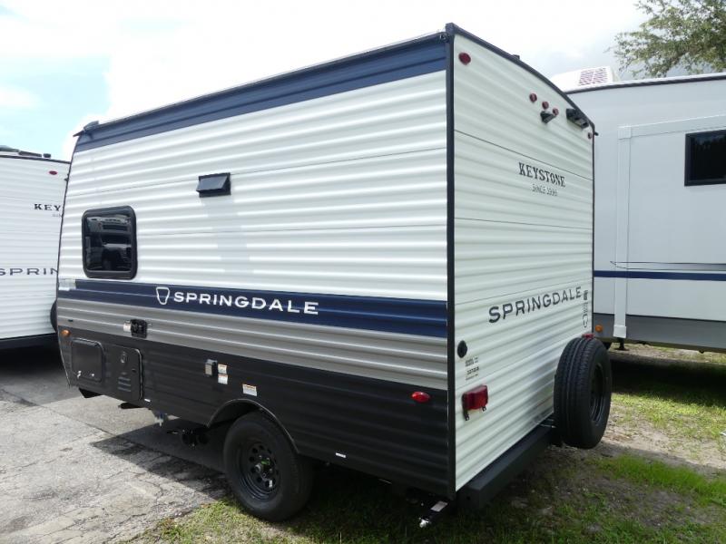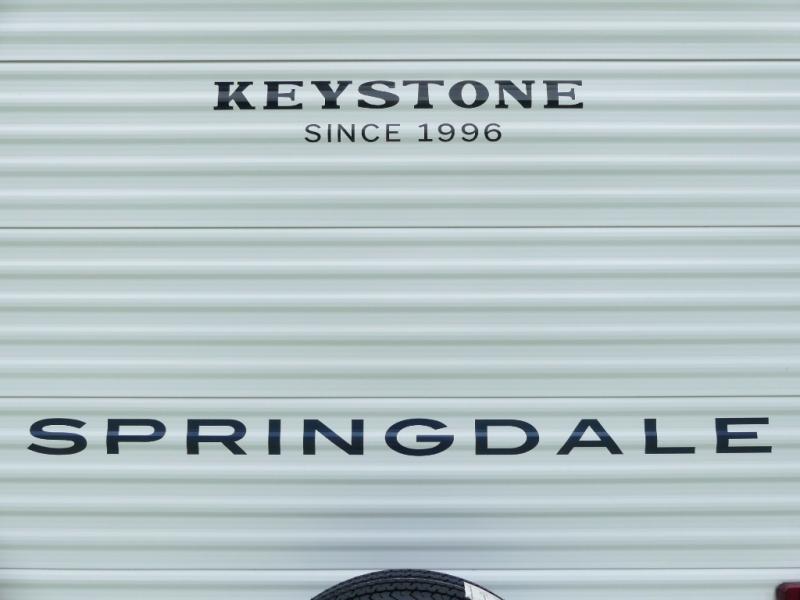 With any Springdale Mini travel trailer by Keystone, you will enjoy lightweight towing thanks to their single-axle! The AlphaPly TPO roof membrane is ultra durable, and the power awning will provide protection from the sun as you relax in your camp chairs outside. Each model includes blackout night shades, LED lighting, plus many more interior comforts. There is also a roof A/C and 20K BTU furnace to keep you comfortable, plus a tankless water heater for endless hot showers!