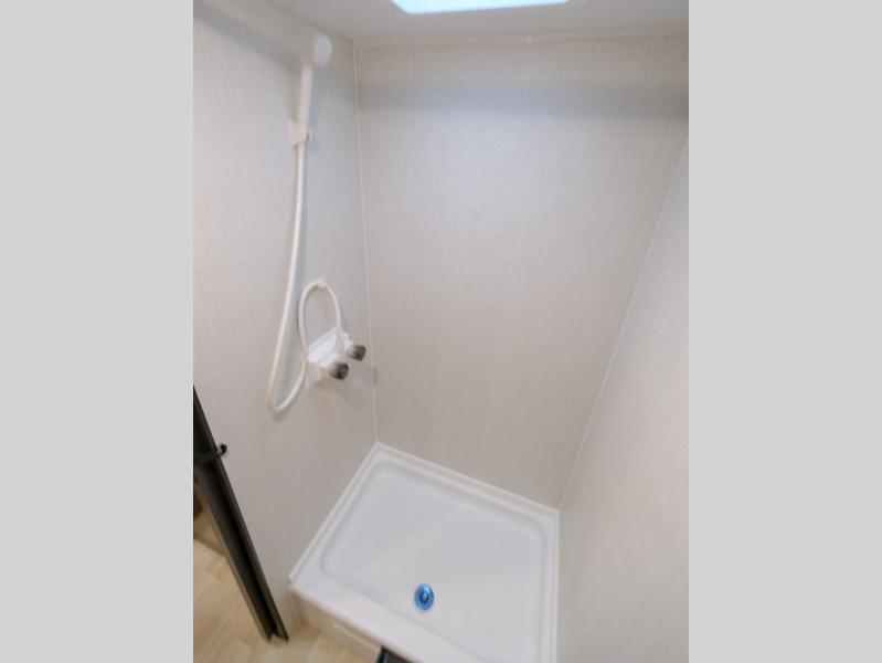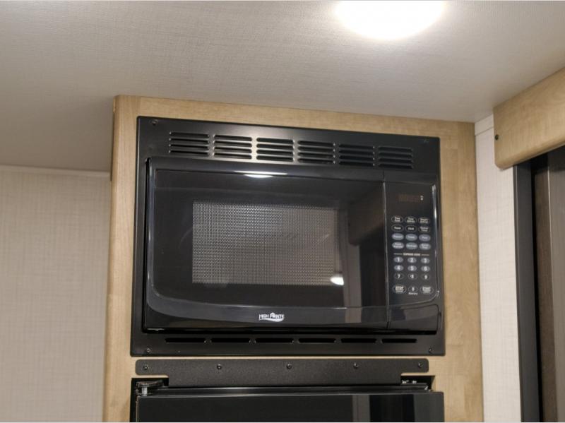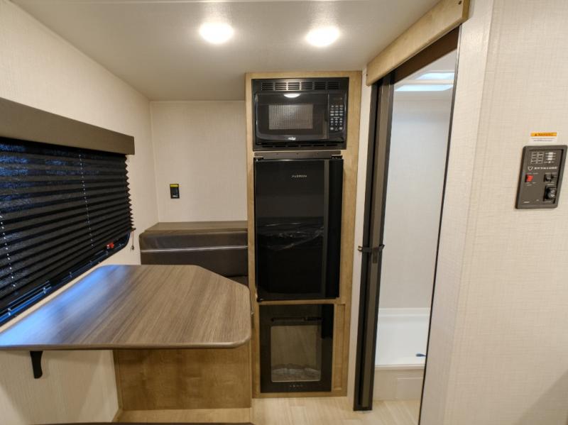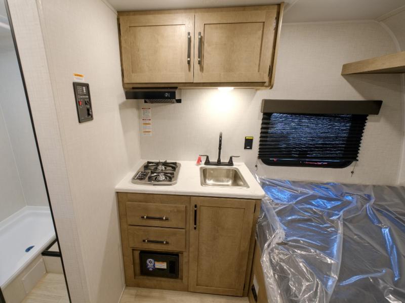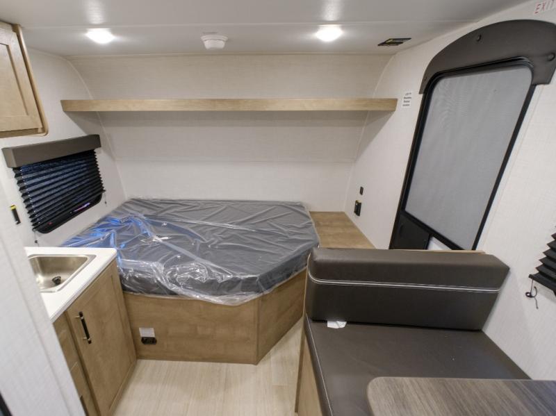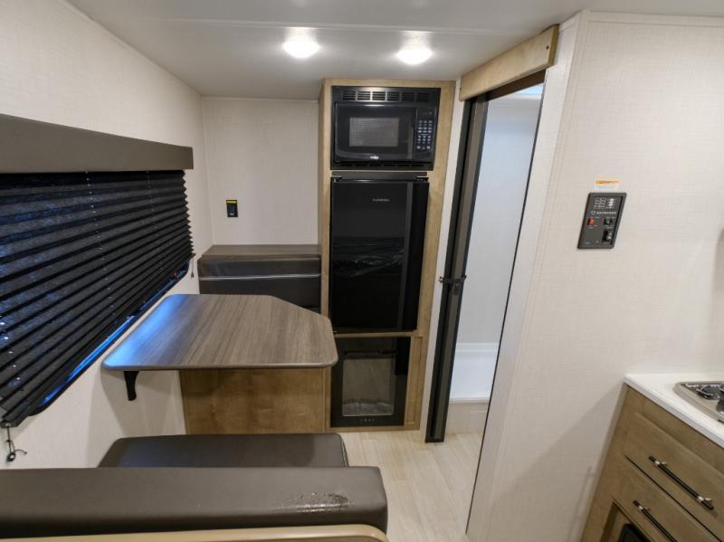 This lightweight travel trailer is perfect for three happy campers. You'll enjoy the front full-size bed, while your guest or little ones take the booth dinette when it's not being used to dine at. There is also a shelf above the bed to keep your things organized. A private bath includes a shower with a toilet so you can freshen up each day without having to leave your camper. You can make your meals on the two burner gas cooktop or in the microwave oven, then take your plate outdoors to eat under the 8' power awning!