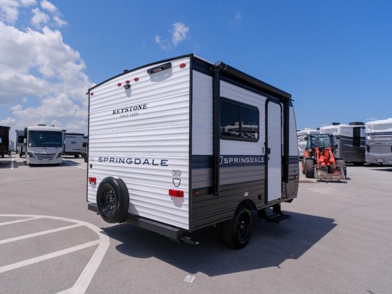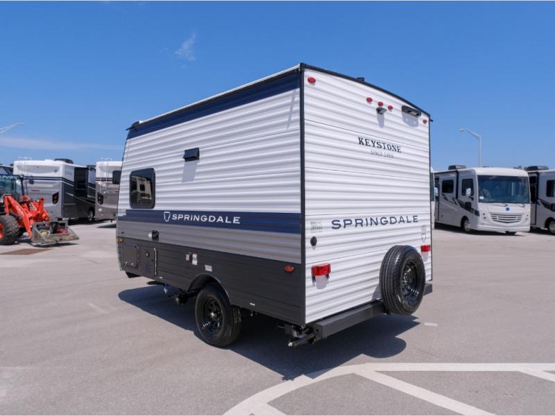 With any Springdale Mini travel trailer by Keystone, you will enjoy lightweight towing thanks to their single-axle! The AlphaPly TPO roof membrane is ultra durable, and the power awning will provide protection from the sun as you relax in your camp chairs outside. Each model includes blackout night shades, LED lighting, plus many more interior comforts. There is also a roof A/C and 20K BTU furnace to keep you comfortable, plus a tankless water heater for endless hot showers!