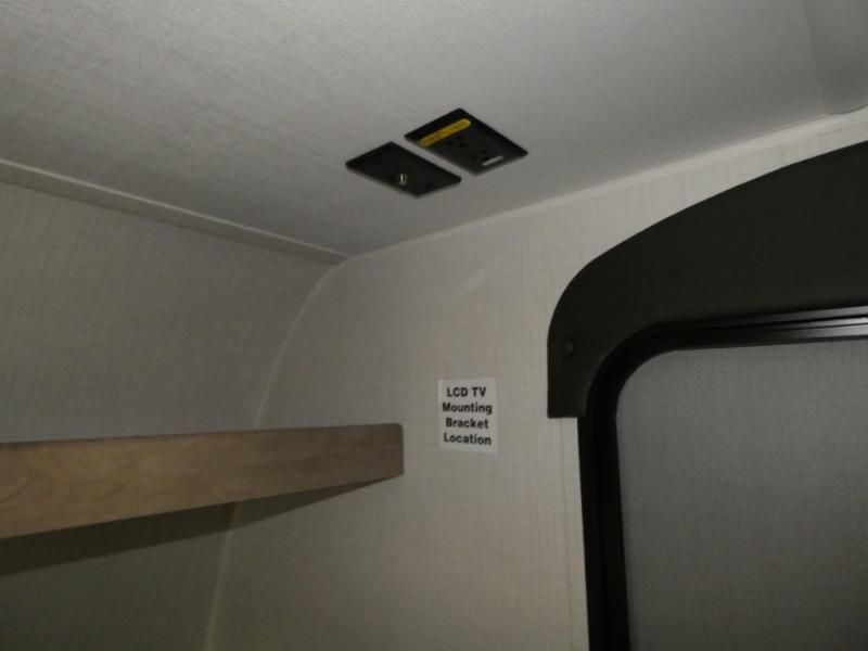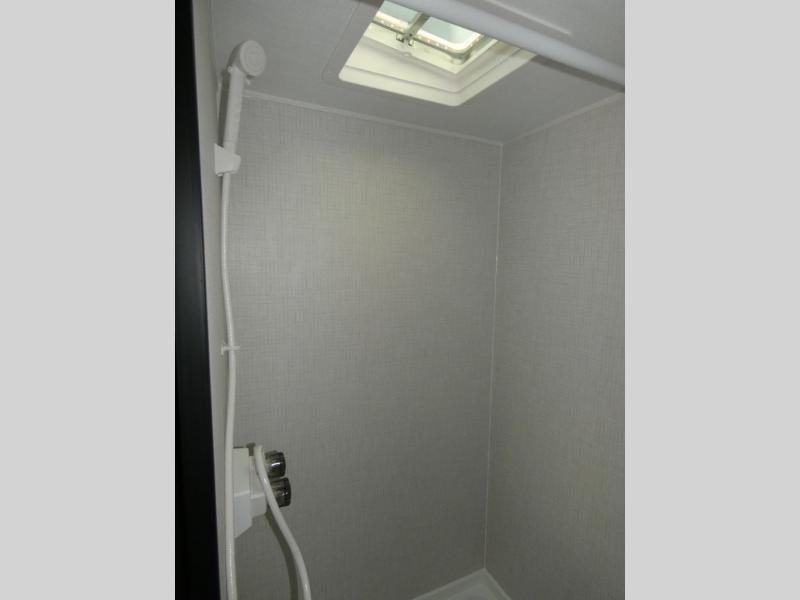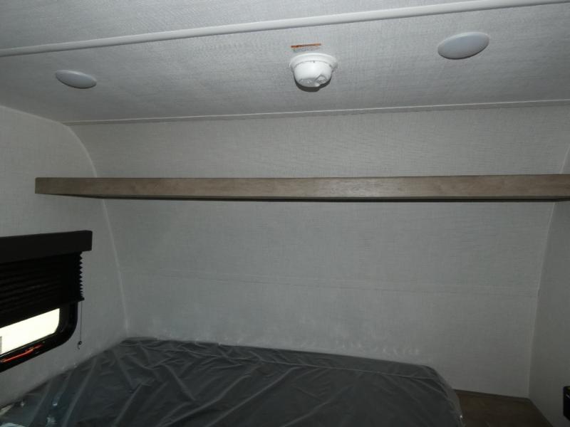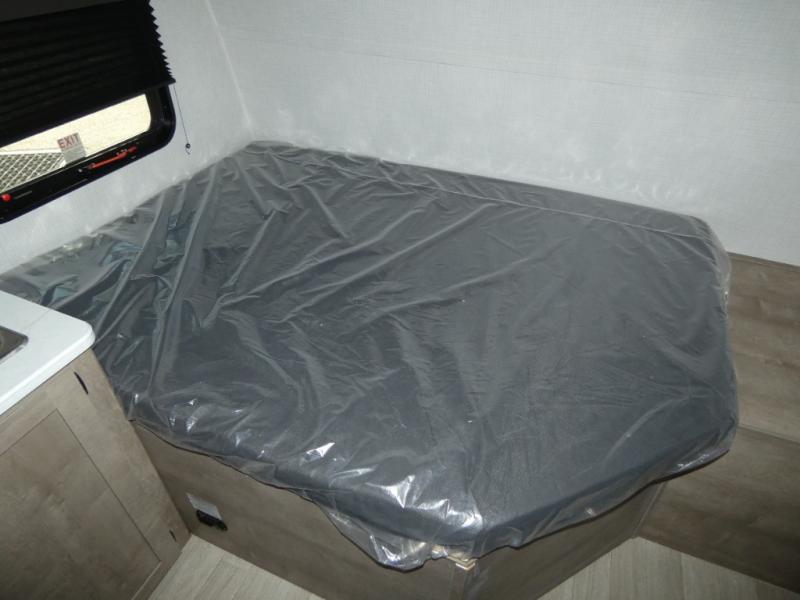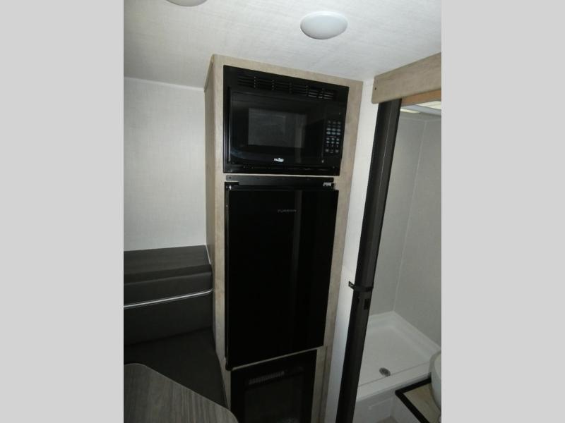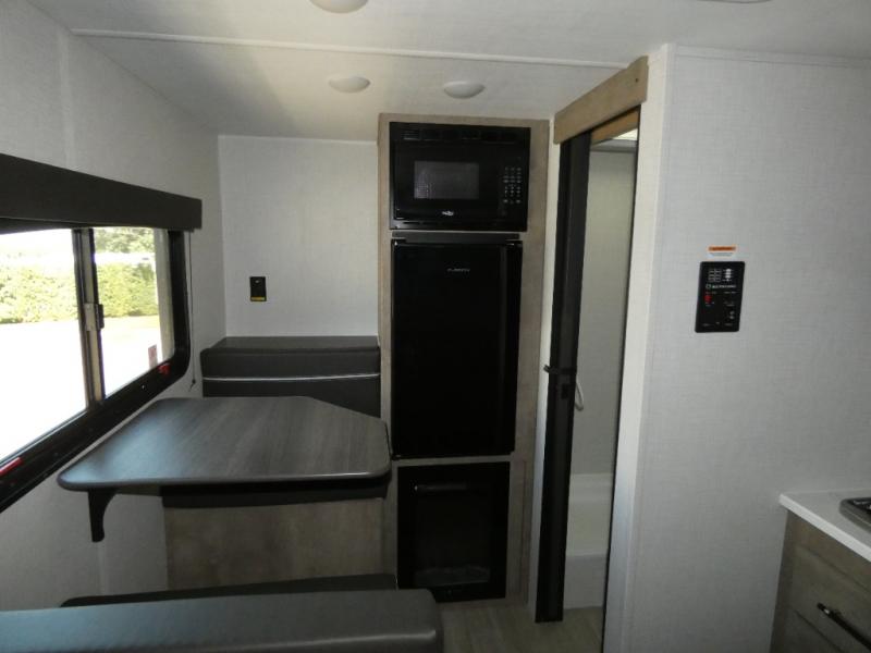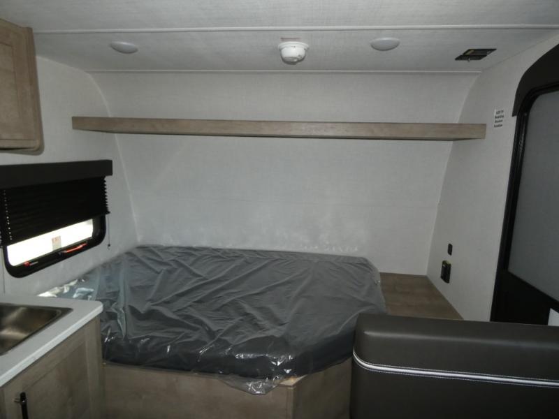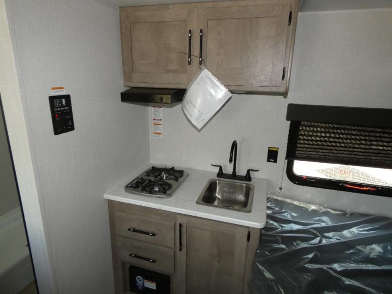 This lightweight travel trailer is perfect for three happy campers. You'll enjoy the front full-size bed, while your guest or little ones take the booth dinette when it's not being used to dine at. There is also a shelf above the bed to keep your things organized. A private bath includes a shower with a toilet so you can freshen up each day without having to leave your camper. You can make your meals on the two burner gas cooktop or in the microwave oven, then take your plate outdoors to eat under the 8' power awning!