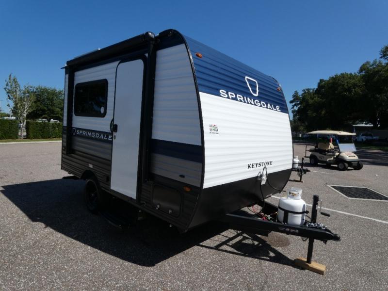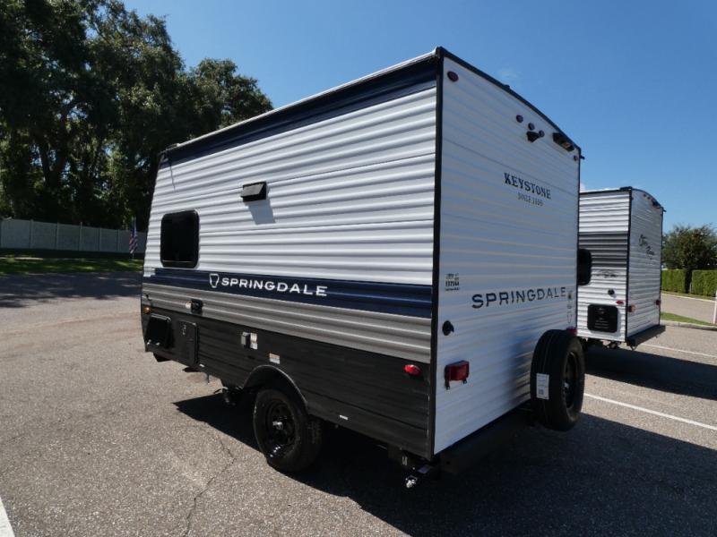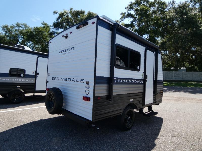 With any Springdale Mini travel trailer by Keystone, you will enjoy lightweight towing thanks to their single-axle! The AlphaPly TPO roof membrane is ultra durable, and the power awning will provide protection from the sun as you relax in your camp chairs outside. Each model includes blackout night shades, LED lighting, plus many more interior comforts. There is also a roof A/C and 20K BTU furnace to keep you comfortable, plus a tankless water heater for endless hot showers!