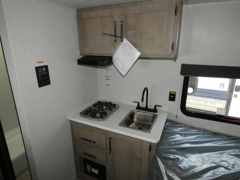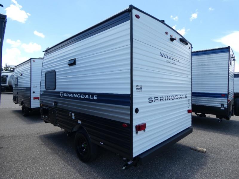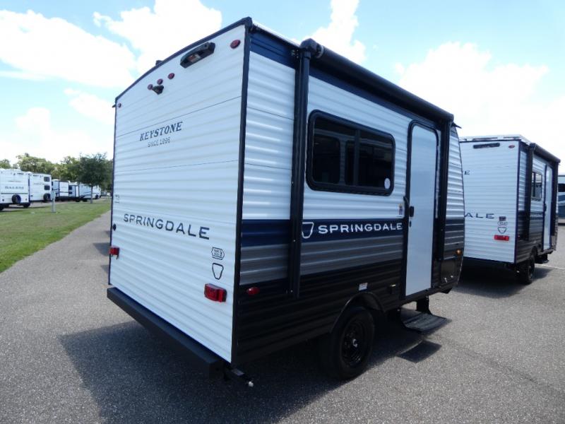 With any Springdale Mini travel trailer by Keystone, you will enjoy lightweight towing thanks to their single-axle! The AlphaPly TPO roof membrane is ultra durable, and the power awning will provide protection from the sun as you relax in your camp chairs outside. Each model includes blackout night shades, LED lighting, plus many more interior comforts. There is also a roof A/C and 20K BTU furnace to keep you comfortable, plus a tankless water heater for endless hot showers!