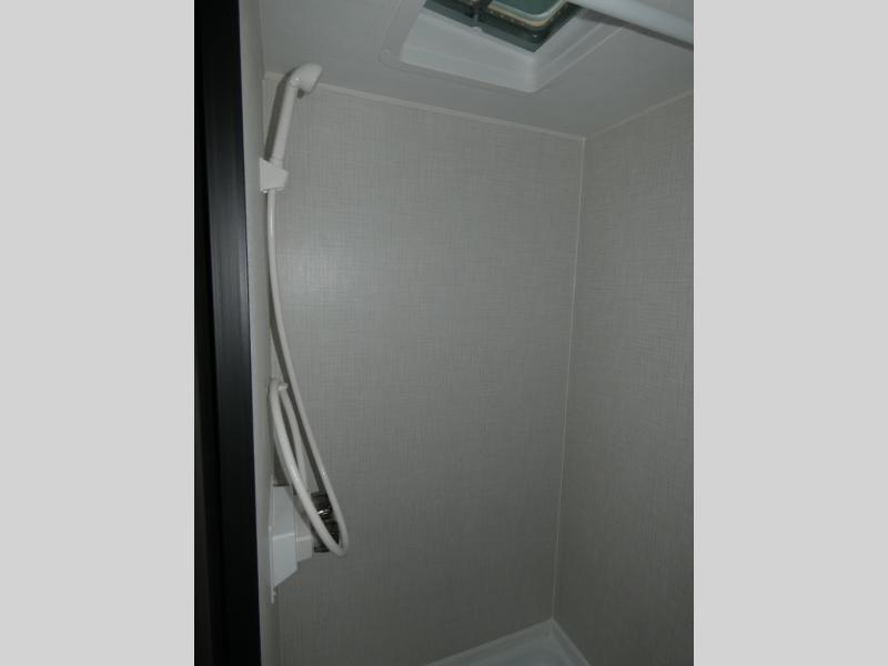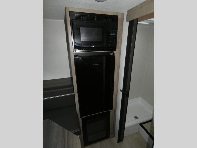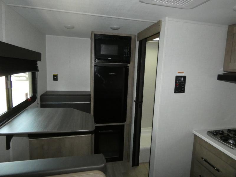 This lightweight travel trailer is perfect for three happy campers. You'll enjoy the front full-size bed, while your guest or little ones take the booth dinette when it's not being used to dine at. There is also a shelf above the bed to keep your things organized. A private bath includes a shower with a toilet so you can freshen up each day without having to leave your camper. You can make your meals on the two burner gas cooktop or in the microwave oven, then take your plate outdoors to eat under the 8' power awning!