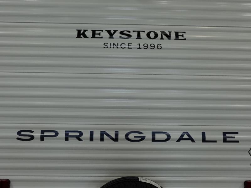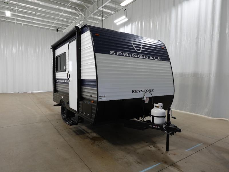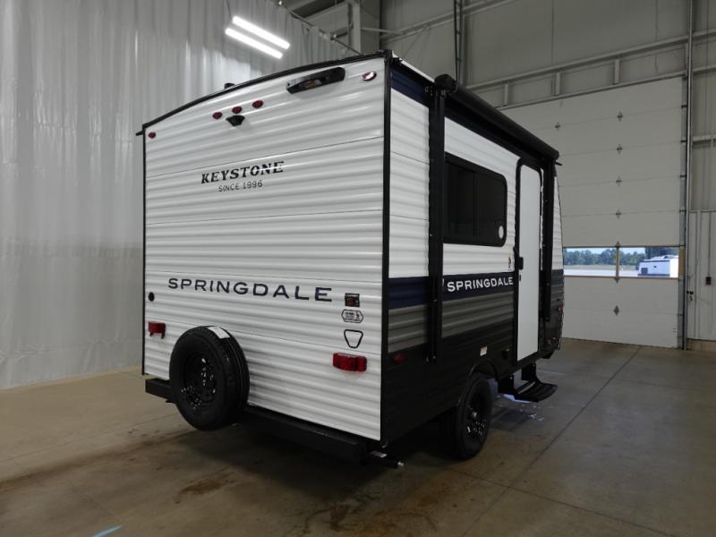 With any Springdale Mini travel trailer by Keystone, you will enjoy lightweight towing thanks to their single-axle! The AlphaPly TPO roof membrane is ultra durable, and the power awning will provide protection from the sun as you relax in your camp chairs outside. Each model includes blackout night shades, LED lighting, plus many more interior comforts. There is also a roof A/C and 20K BTU furnace to keep you comfortable, plus a tankless water heater for endless hot showers!
