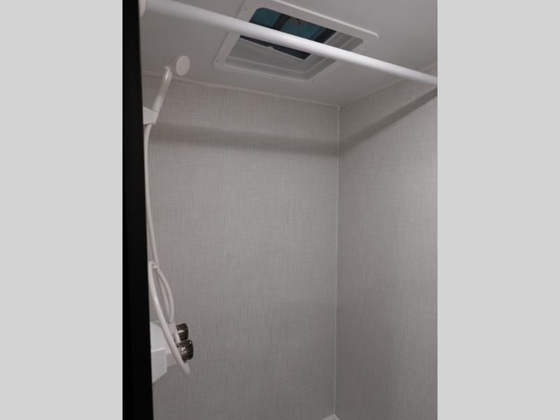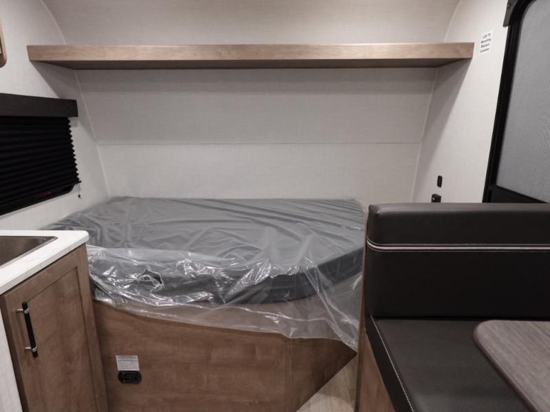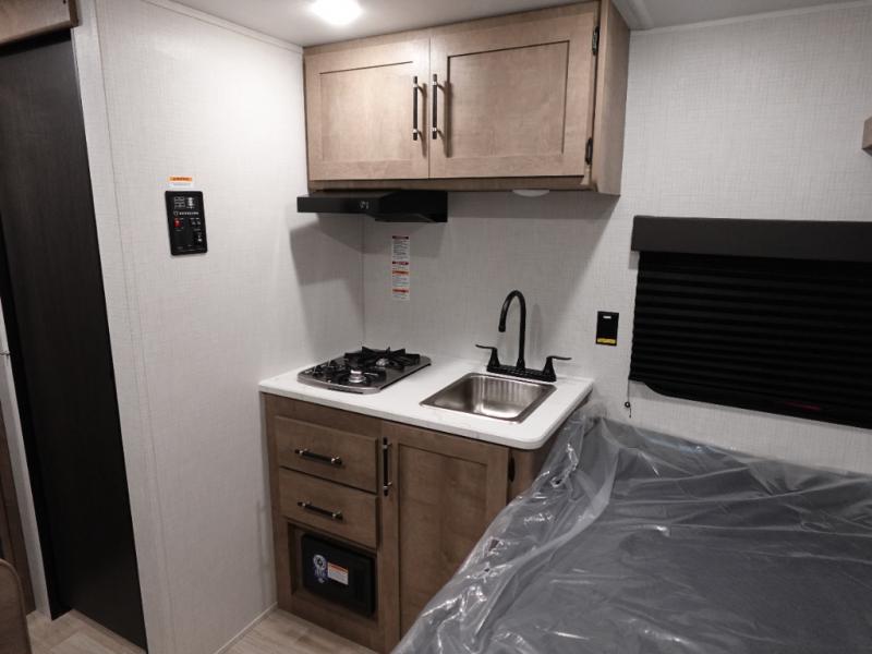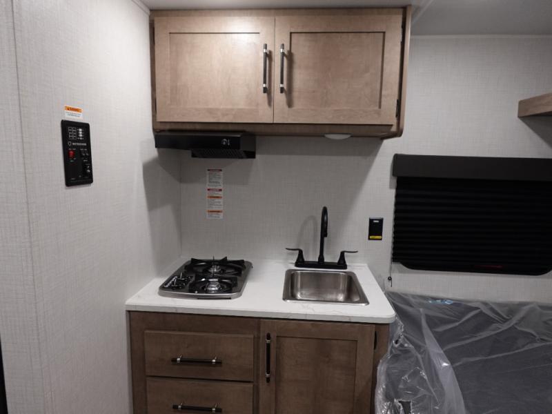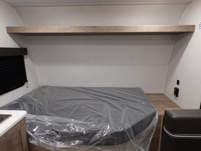 This lightweight travel trailer is perfect for three happy campers. You'll enjoy the front full-size bed, while your guest or little ones take the booth dinette when it's not being used to dine at. There is also a shelf above the bed to keep your things organized. A private bath includes a shower with a toilet so you can freshen up each day without having to leave your camper. You can make your meals on the two burner gas cooktop or in the microwave oven, then take your plate outdoors to eat under the 8' power awning!