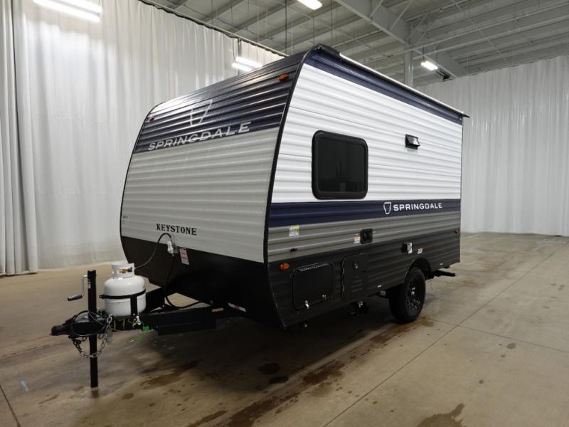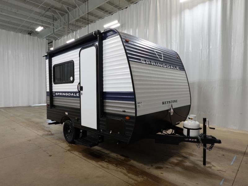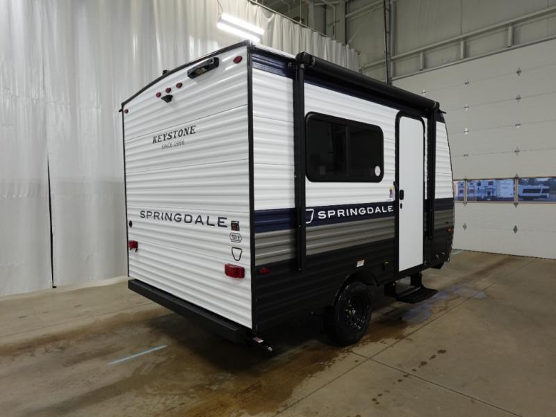 With any Springdale Mini travel trailer by Keystone, you will enjoy lightweight towing thanks to their single-axle! The AlphaPly TPO roof membrane is ultra durable, and the power awning will provide protection from the sun as you relax in your camp chairs outside. Each model includes blackout night shades, LED lighting, plus many more interior comforts. There is also a roof A/C and 20K BTU furnace to keep you comfortable, plus a tankless water heater for endless hot showers!