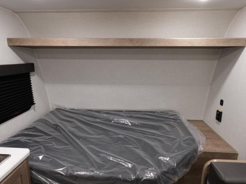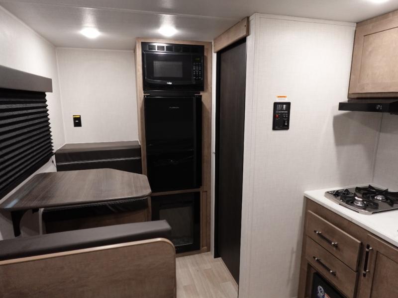 This lightweight travel trailer is perfect for three happy campers. You'll enjoy the front full-size bed, while your guest or little ones take the booth dinette when it's not being used to dine at. There is also a shelf above the bed to keep your things organized. A private bath includes a shower with a toilet so you can freshen up each day without having to leave your camper. You can make your meals on the two burner gas cooktop or in the microwave oven, then take your plate outdoors to eat under the 8' power awning!