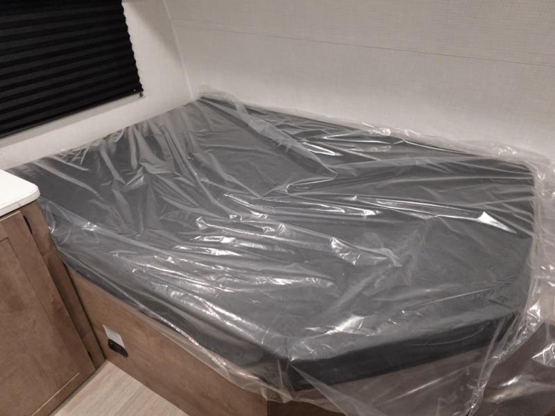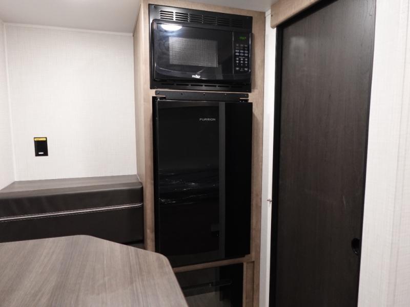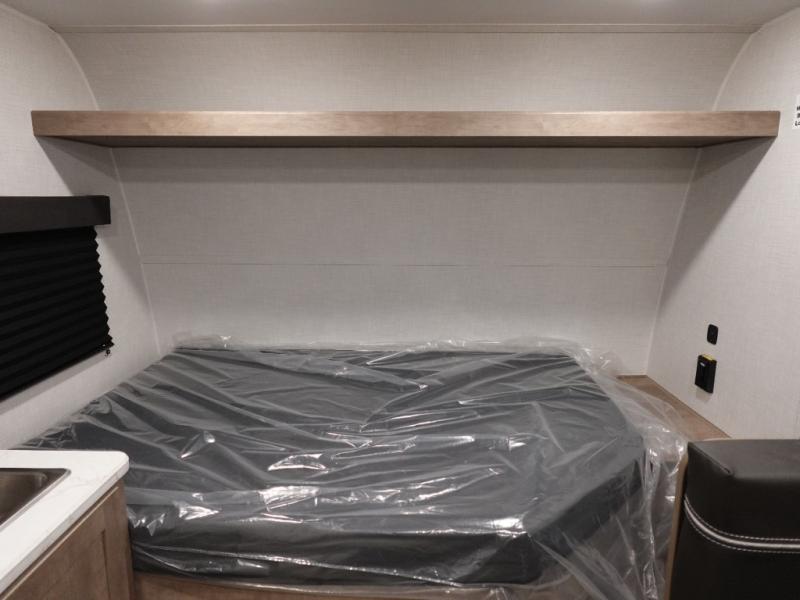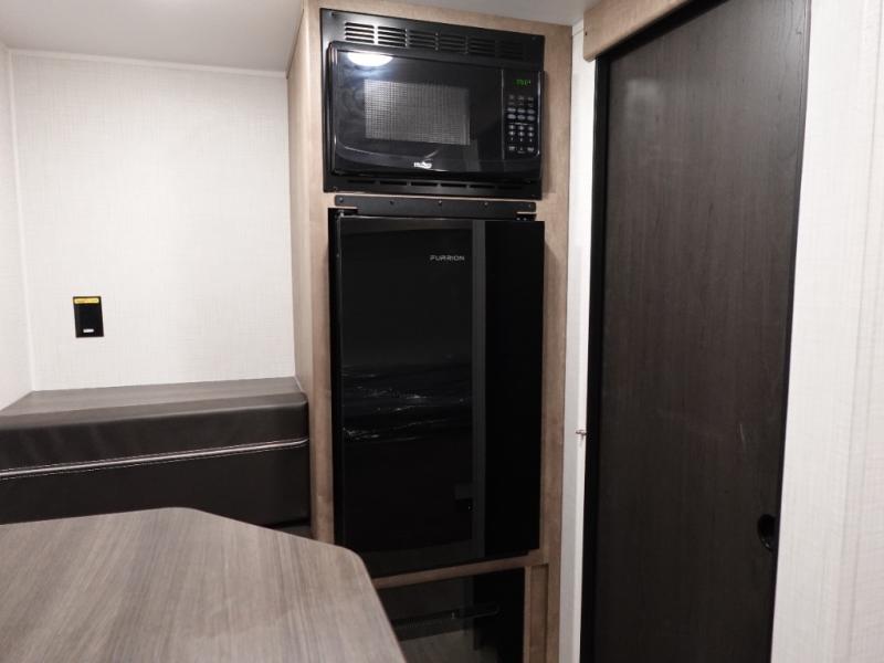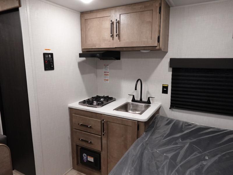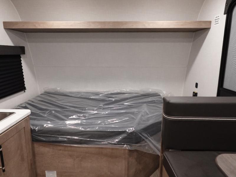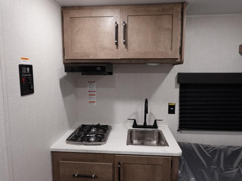 This lightweight travel trailer is perfect for three happy campers. You'll enjoy the front full-size bed, while your guest or little ones take the booth dinette when it's not being used to dine at. There is also a shelf above the bed to keep your things organized. A private bath includes a shower with a toilet so you can freshen up each day without having to leave your camper. You can make your meals on the two burner gas cooktop or in the microwave oven, then take your plate outdoors to eat under the 8' power awning!