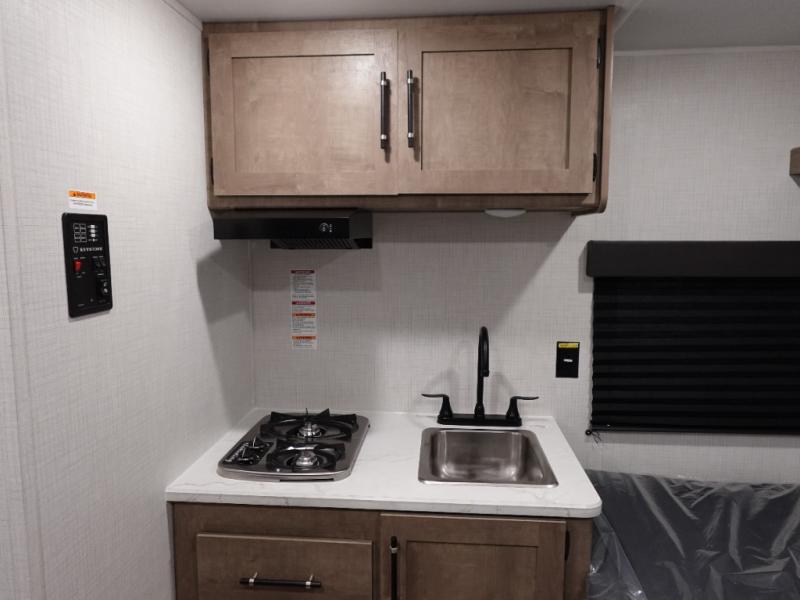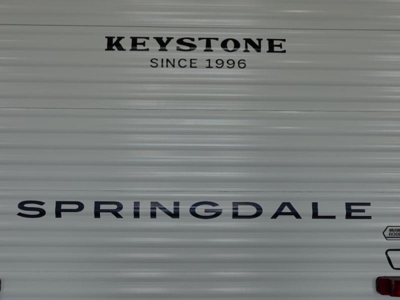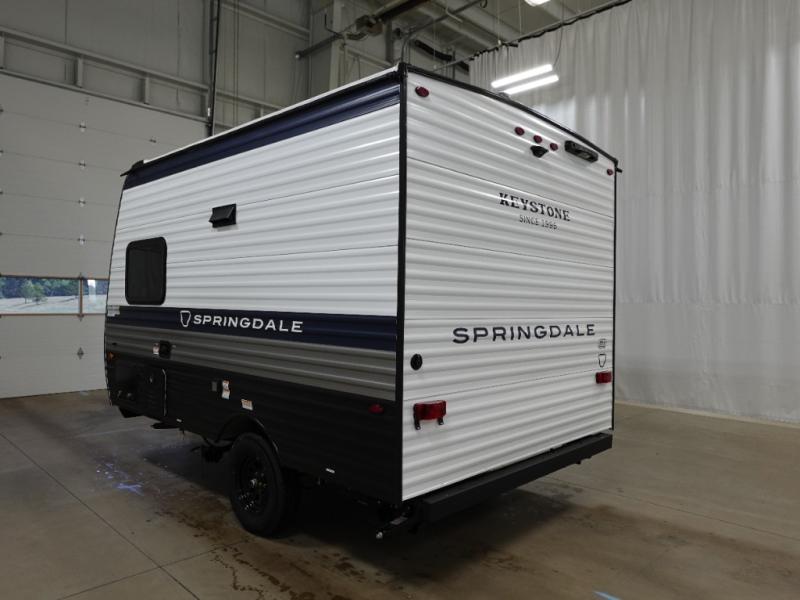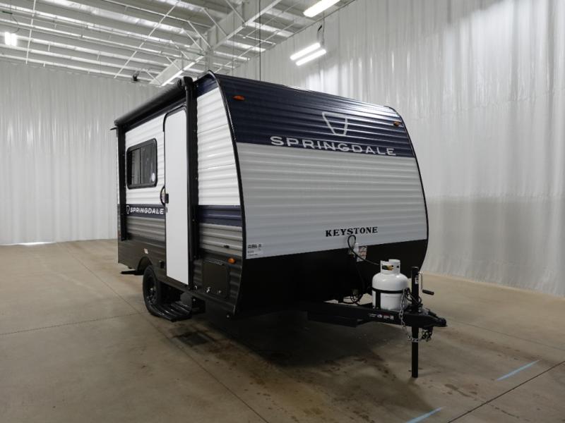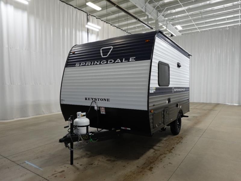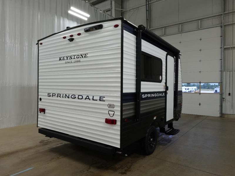 With any Springdale Mini travel trailer by Keystone, you will enjoy lightweight towing thanks to their single-axle! The AlphaPly TPO roof membrane is ultra durable, and the power awning will provide protection from the sun as you relax in your camp chairs outside. Each model includes blackout night shades, LED lighting, plus many more interior comforts. There is also a roof A/C and 20K BTU furnace to keep you comfortable, plus a tankless water heater for endless hot showers!
