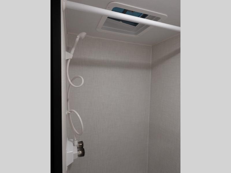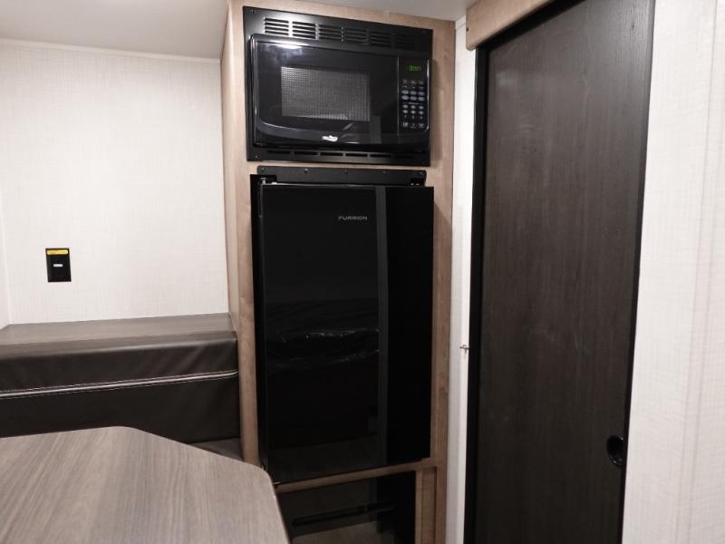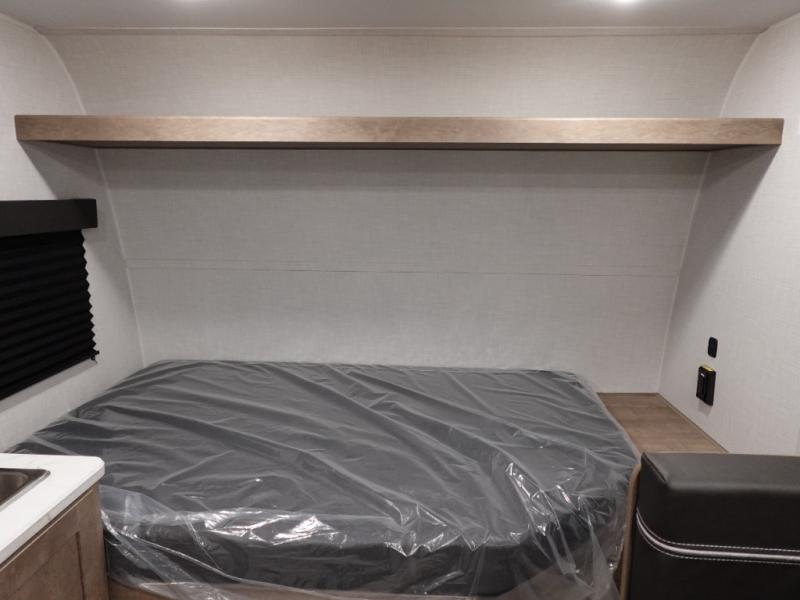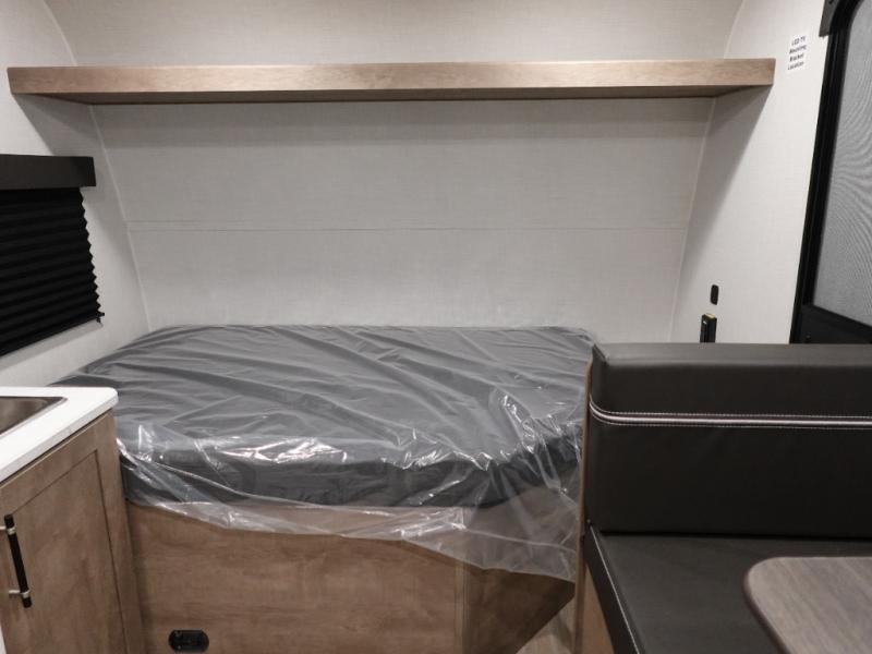 This lightweight travel trailer is perfect for three happy campers. You'll enjoy the front full-size bed, while your guest or little ones take the booth dinette when it's not being used to dine at. There is also a shelf above the bed to keep your things organized. A private bath includes a shower with a toilet so you can freshen up each day without having to leave your camper. You can make your meals on the two burner gas cooktop or in the microwave oven, then take your plate outdoors to eat under the 8' power awning!
