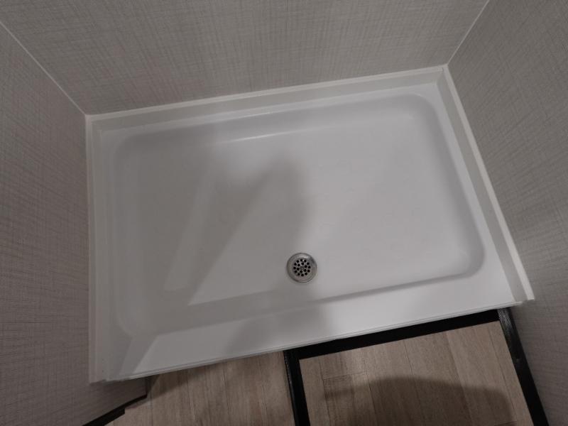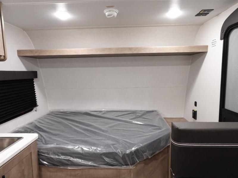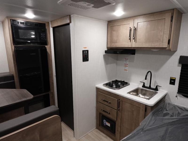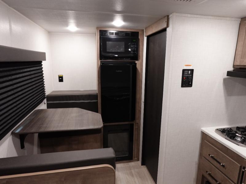 This lightweight travel trailer is perfect for three happy campers. You'll enjoy the front full-size bed, while your guest or little ones take the booth dinette when it's not being used to dine at. There is also a shelf above the bed to keep your things organized. A private bath includes a shower with a toilet so you can freshen up each day without having to leave your camper. You can make your meals on the two burner gas cooktop or in the microwave oven, then take your plate outdoors to eat under the 8' power awning!