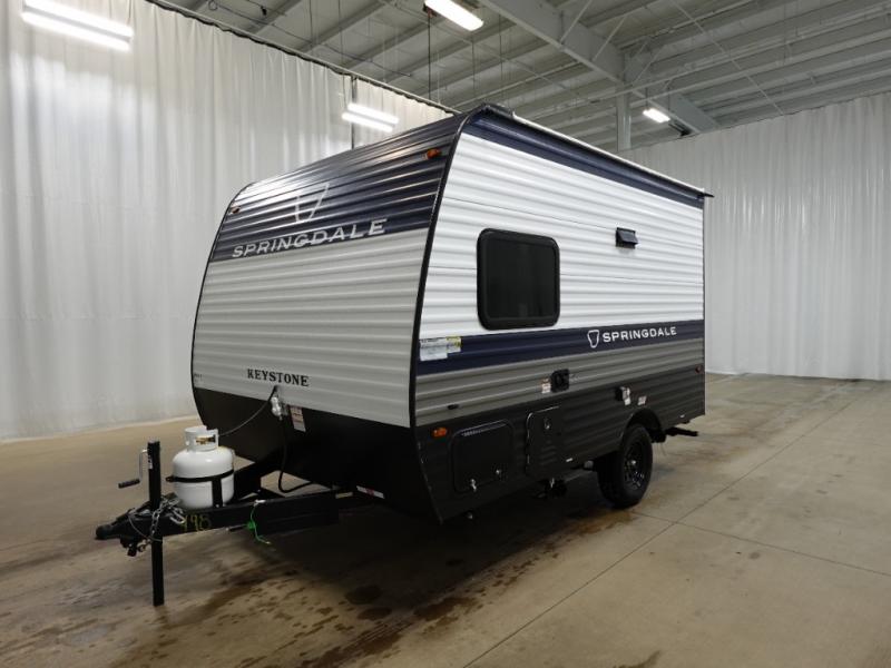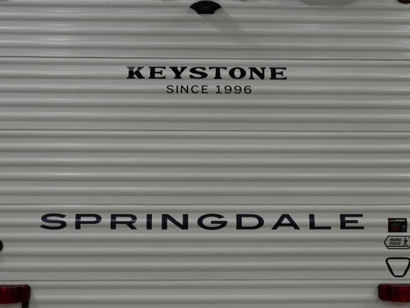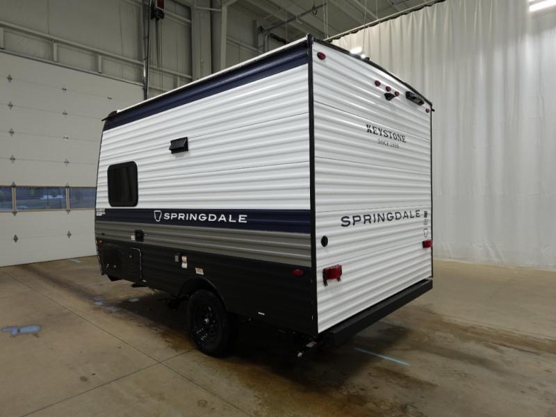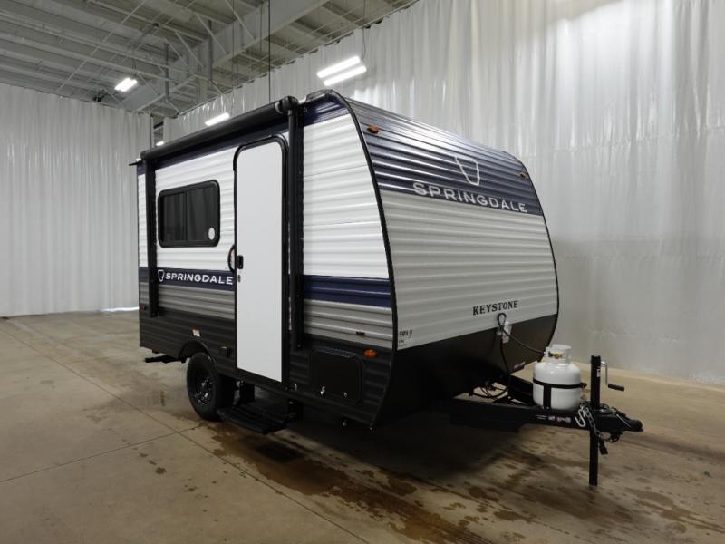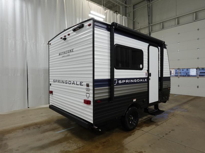 With any Springdale Mini travel trailer by Keystone, you will enjoy lightweight towing thanks to their single-axle! The AlphaPly TPO roof membrane is ultra durable, and the power awning will provide protection from the sun as you relax in your camp chairs outside. Each model includes blackout night shades, LED lighting, plus many more interior comforts. There is also a roof A/C and 20K BTU furnace to keep you comfortable, plus a tankless water heater for endless hot showers!
