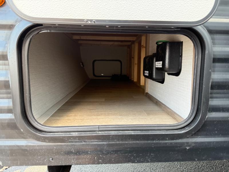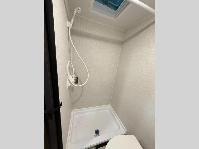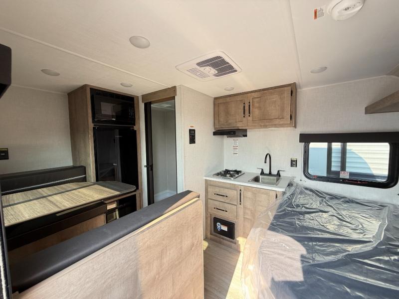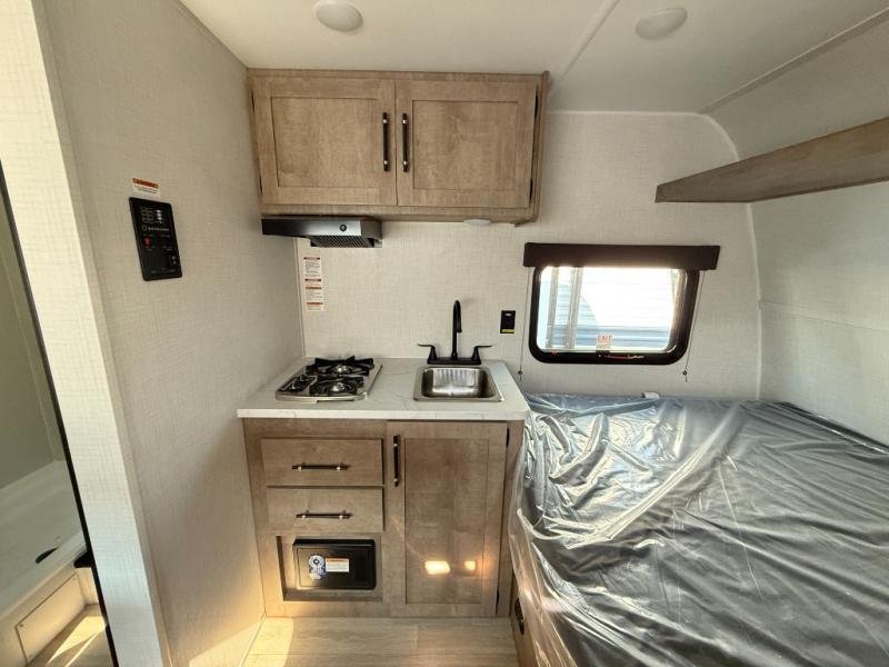 This lightweight travel trailer is perfect for three happy campers. You'll enjoy the front full-size bed, while your guest or little ones take the booth dinette when it's not being used to dine at. There is also a shelf above the bed to keep your things organized. A private bath includes a shower with a toilet so you can freshen up each day without having to leave your camper. You can make your meals on the two burner gas cooktop or in the microwave oven, then take your plate outdoors to eat under the 8' power awning!