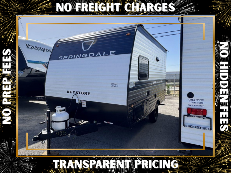 With any Springdale Mini travel trailer by Keystone, you will enjoy lightweight towing thanks to their single-axle! The AlphaPly TPO roof membrane is ultra durable, and the power awning will provide protection from the sun as you relax in your camp chairs outside. Each model includes blackout night shades, LED lighting, plus many more interior comforts. There is also a roof A/C and 20K BTU furnace to keep you comfortable, plus a tankless water heater for endless hot showers!