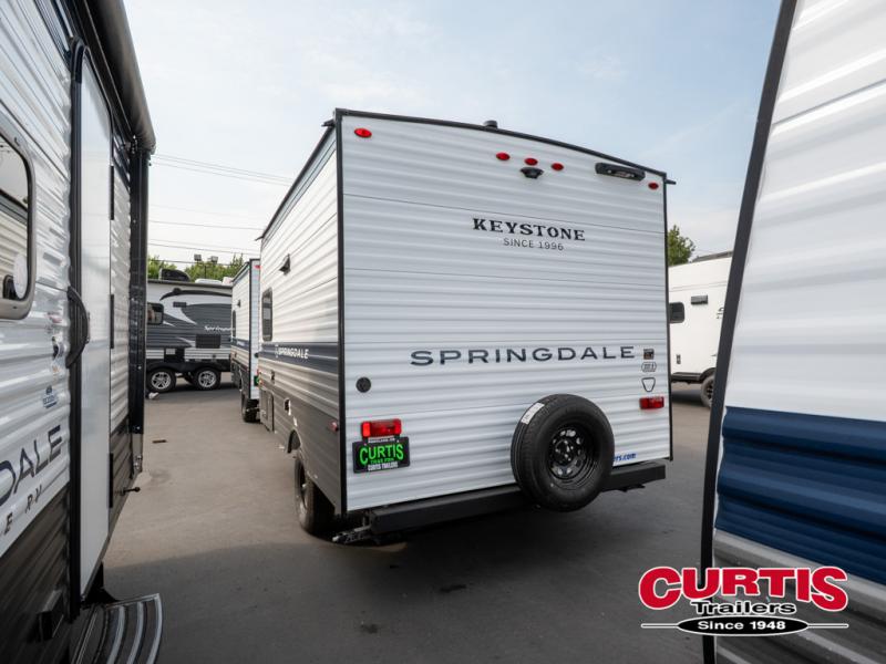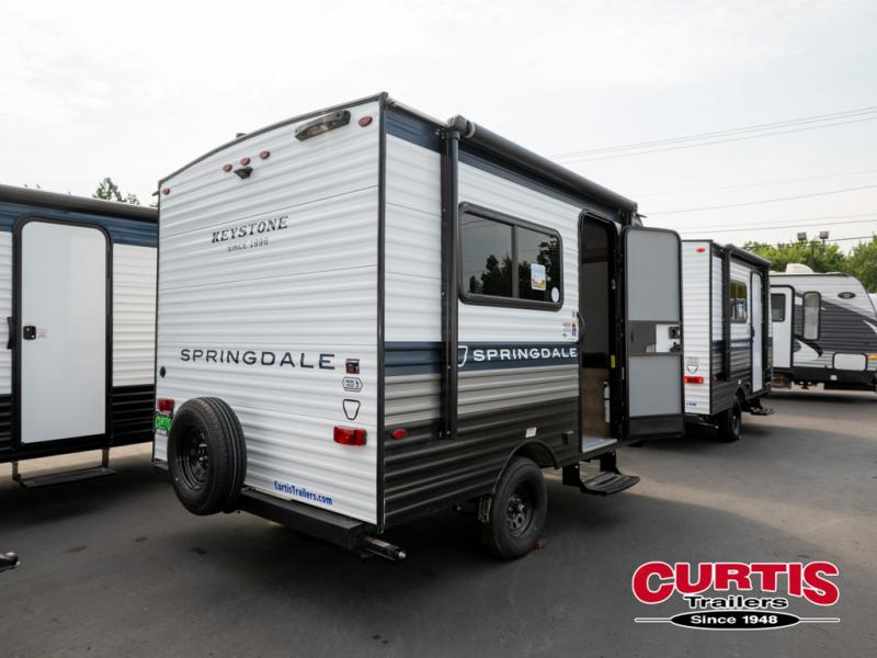 With any Springdale Mini travel trailer by Keystone, you will enjoy lightweight towing thanks to their single-axle! The AlphaPly TPO roof membrane is ultra durable, and the power awning will provide protection from the sun as you relax in your camp chairs outside. Each model includes blackout night shades, LED lighting, plus many more interior comforts. There is also a roof A/C and 20K BTU furnace to keep you comfortable, plus a tankless water heater for endless hot showers!