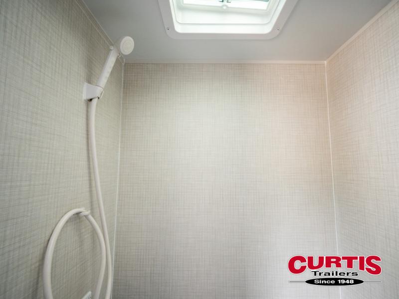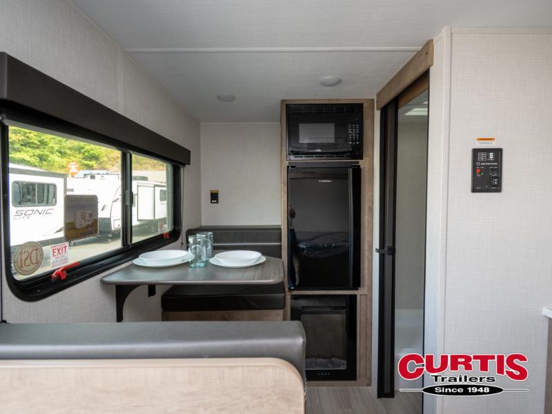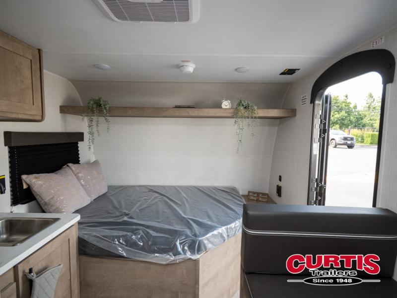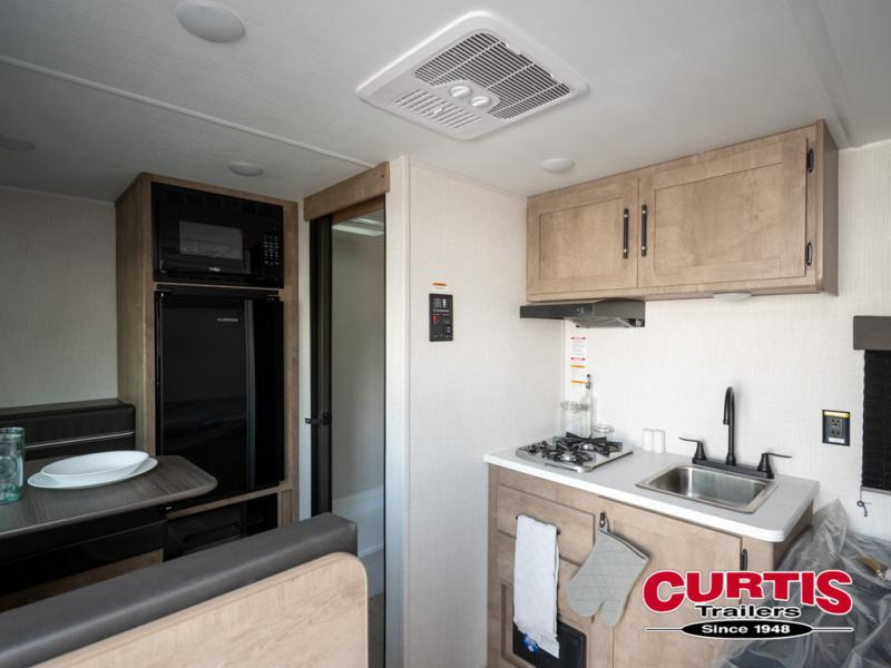 This lightweight travel trailer is perfect for three happy campers. You'll enjoy the front full-size bed, while your guest or little ones take the booth dinette when it's not being used to dine at. There is also a shelf above the bed to keep your things organized. A private bath includes a shower with a toilet so you can freshen up each day without having to leave your camper. You can make your meals on the two burner gas cooktop or in the microwave oven, then take your plate outdoors to eat under the 8' power awning!