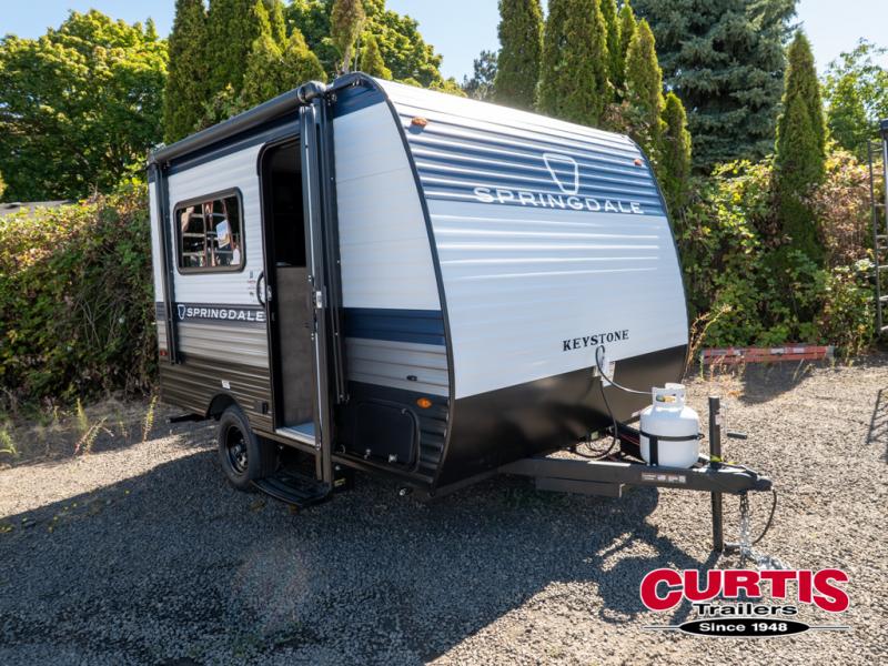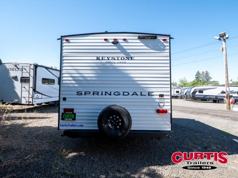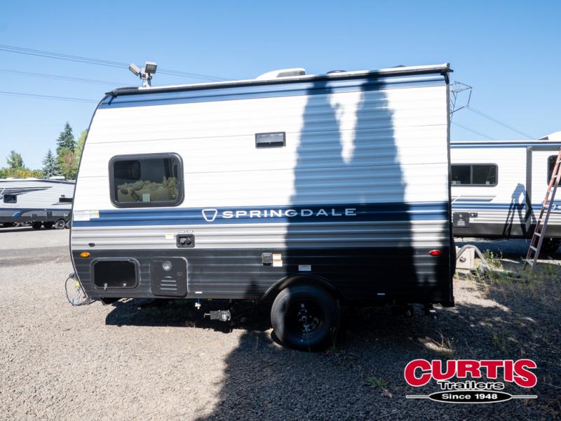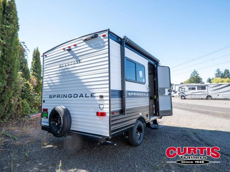 With any Springdale Mini travel trailer by Keystone, you will enjoy lightweight towing thanks to their single-axle! The AlphaPly TPO roof membrane is ultra durable, and the power awning will provide protection from the sun as you relax in your camp chairs outside. Each model includes blackout night shades, LED lighting, plus many more interior comforts. There is also a roof A/C and 20K BTU furnace to keep you comfortable, plus a tankless water heater for endless hot showers!