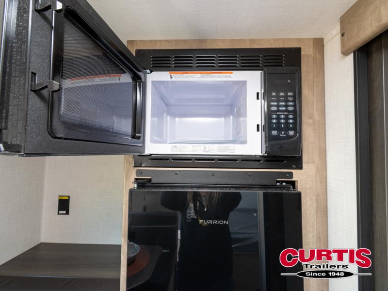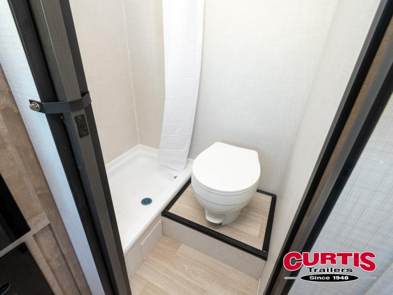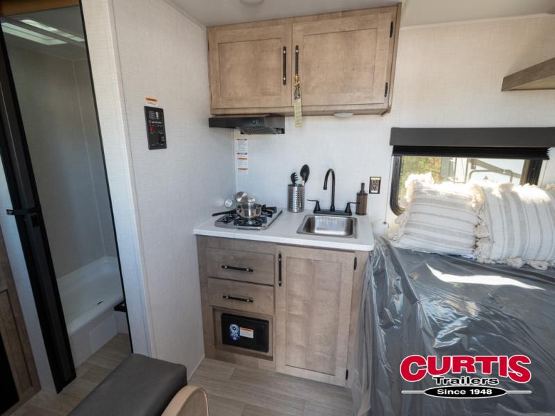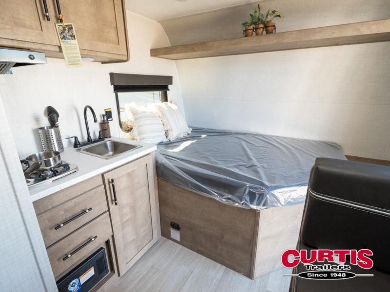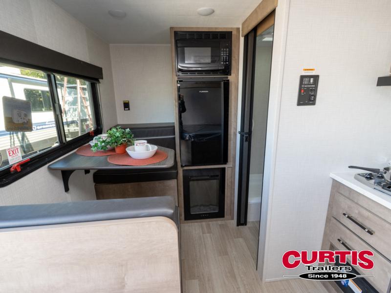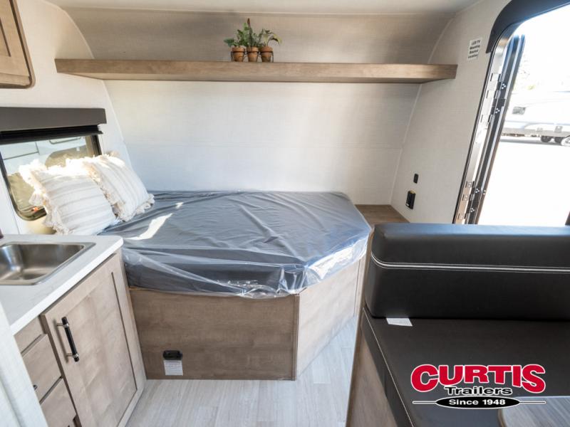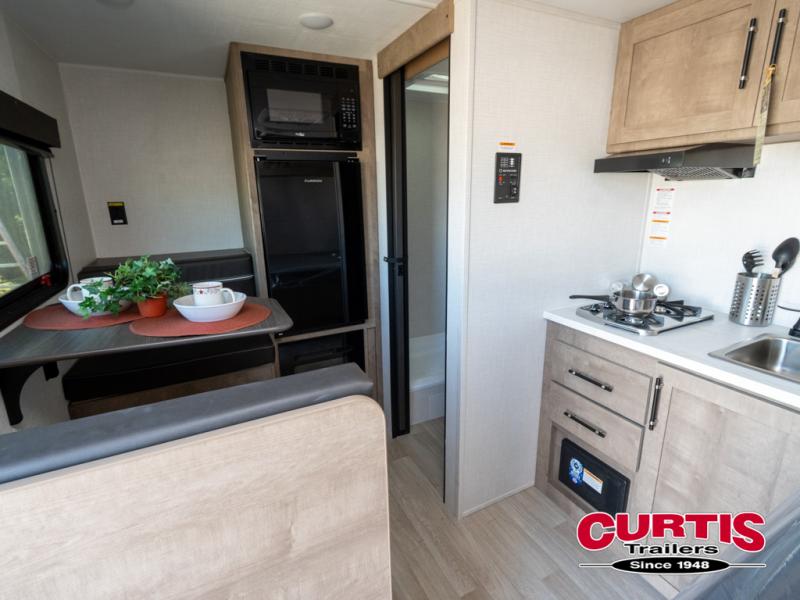 This lightweight travel trailer is perfect for three happy campers. You'll enjoy the front full-size bed, while your guest or little ones take the booth dinette when it's not being used to dine at. There is also a shelf above the bed to keep your things organized. A private bath includes a shower with a toilet so you can freshen up each day without having to leave your camper. You can make your meals on the two burner gas cooktop or in the microwave oven, then take your plate outdoors to eat under the 8' power awning!