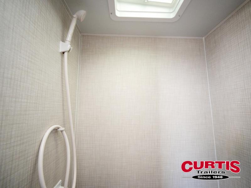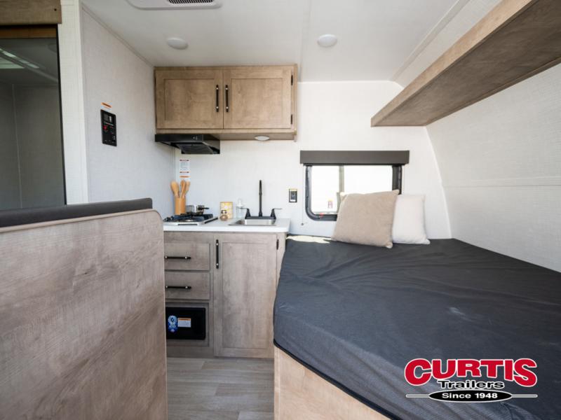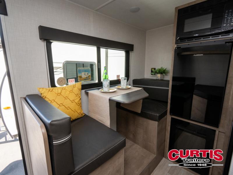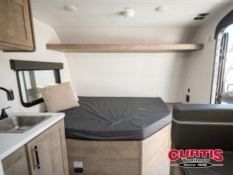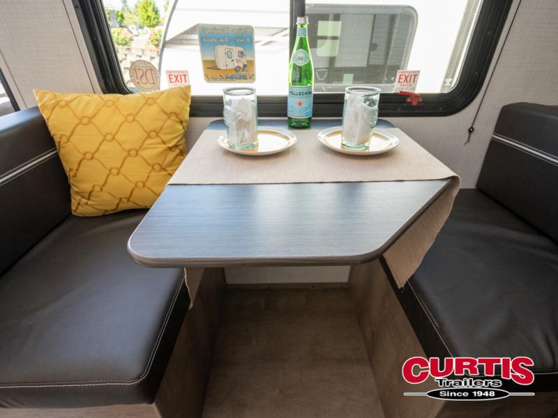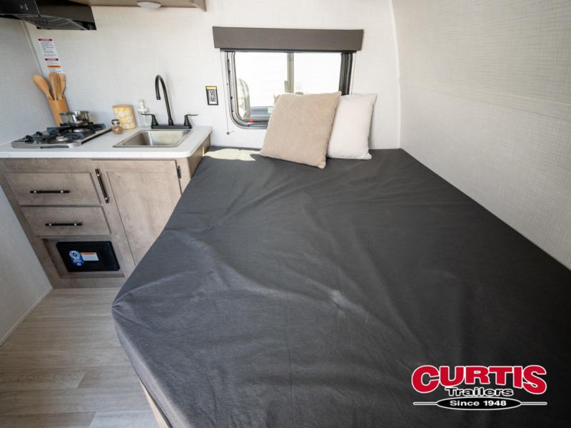 This lightweight travel trailer is perfect for three happy campers. You'll enjoy the front full-size bed, while your guest or little ones take the booth dinette when it's not being used to dine at. There is also a shelf above the bed to keep your things organized. A private bath includes a shower with a toilet so you can freshen up each day without having to leave your camper. You can make your meals on the two burner gas cooktop or in the microwave oven, then take your plate outdoors to eat under the 8' power awning!