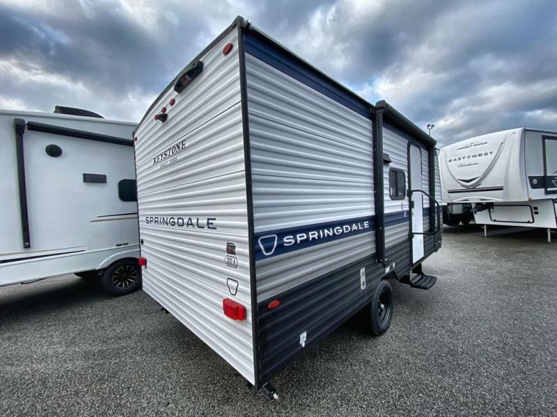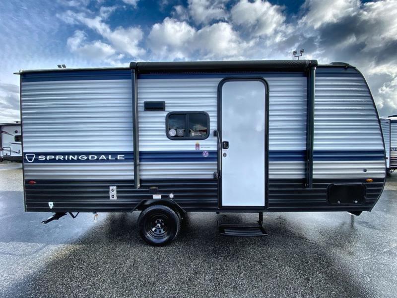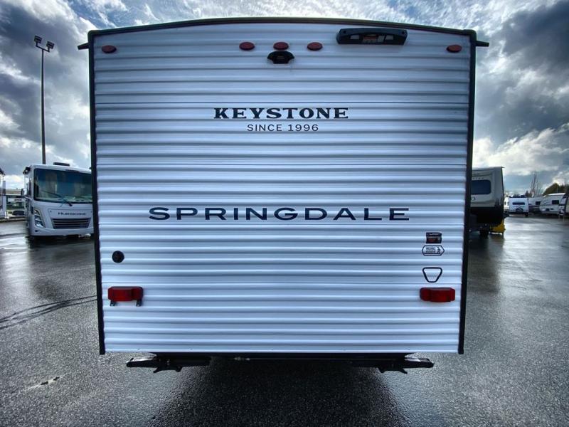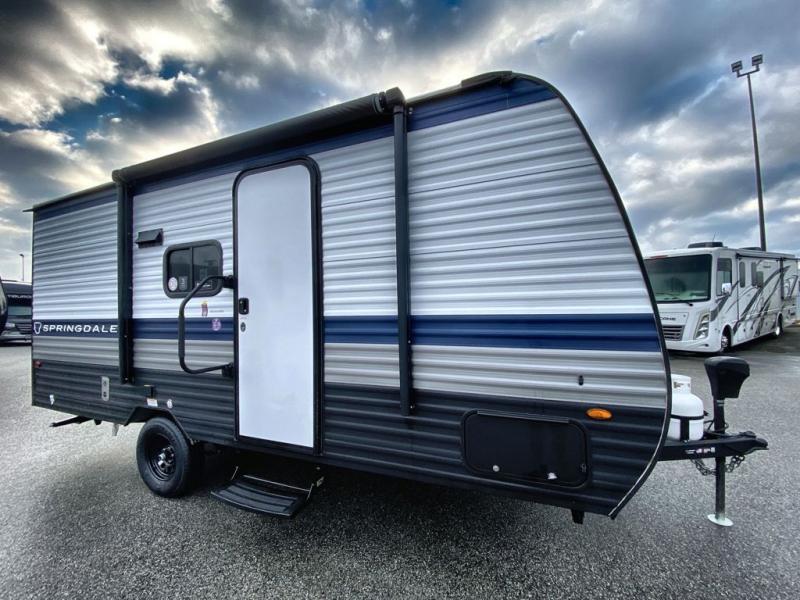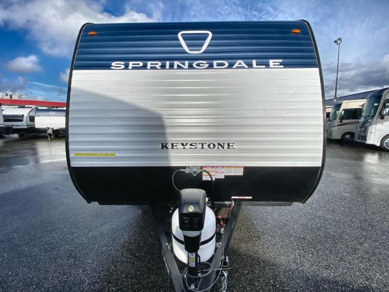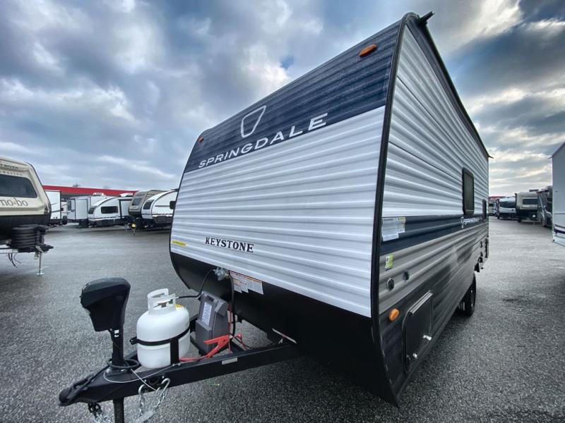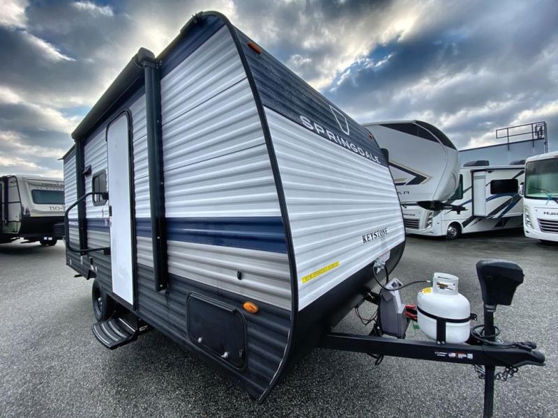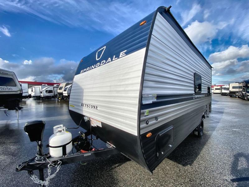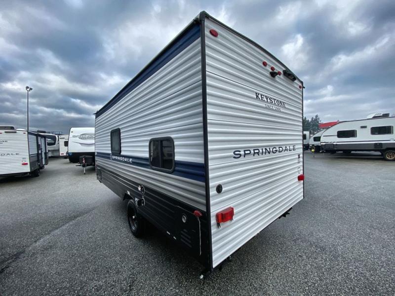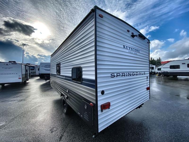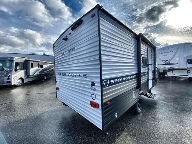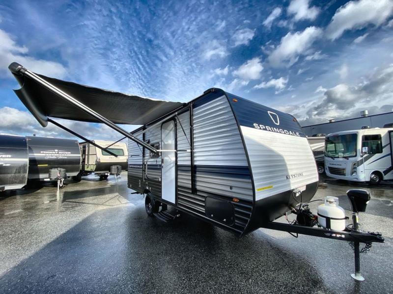 With any Springdale Mini travel trailer by Keystone, you will enjoy lightweight towing thanks to their single axle! The XL tinted safety glass windows are ultra durable, and the power awning will provide protection from the sun as you relax in your camp chairs outside. Each model includes blackout night shades, LED lighting, plus many more interior comforts. There is also a 20K BTU furnace to keep you comfortable, plus a tankless water heater for endless hot showers!