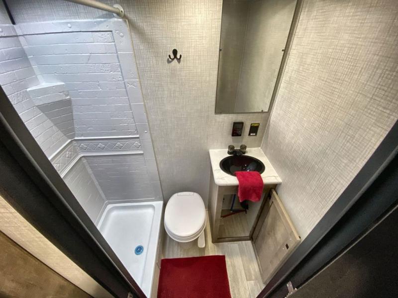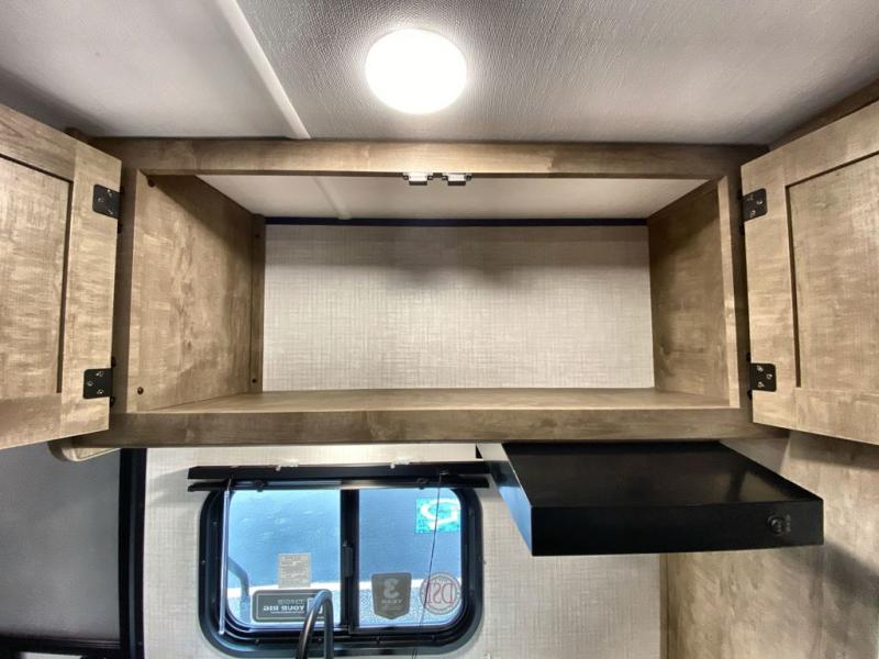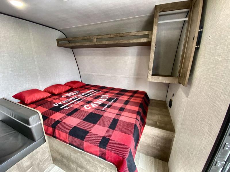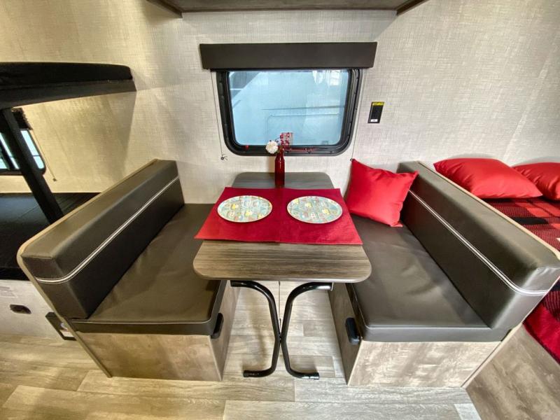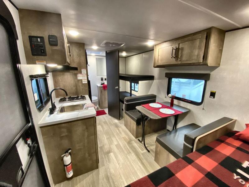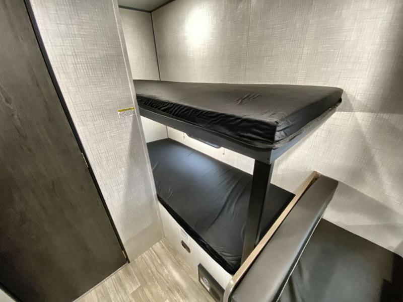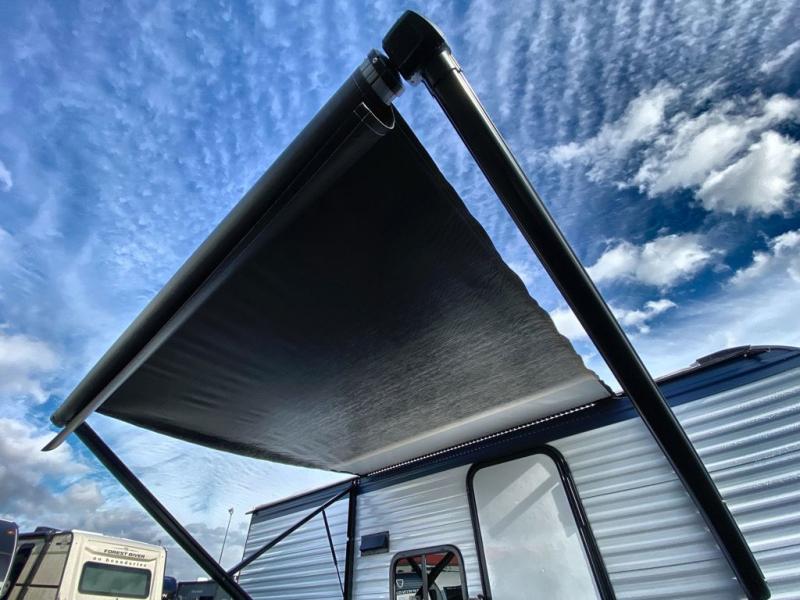 This travel trailer with rear corner bunk beds is sure to be a hit at the campground! While your guests or little ones take the bunks, you can enjoy the front Olympic RV queen bed to yourselves. There is even storage under the bed, an overhead shelf, and a wardrobe for your things. The chef of your group can whip up meals on the two-burner cooktop or in the microwave oven, and there is a 3.3 cu. ft. 12V refrigerator to keep food fresh. A booth dinette provides a place to dine together, or you can take your plate outdoors to sit under the 8' power awning with LED lights!