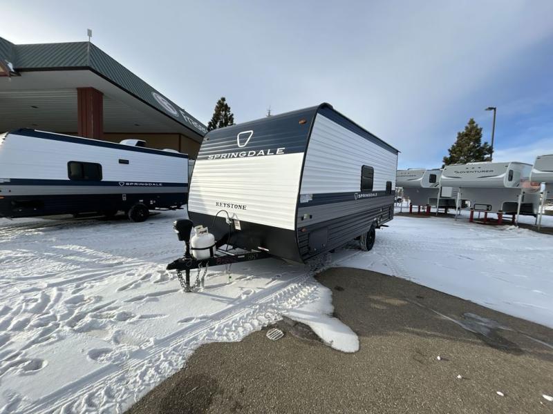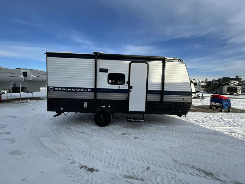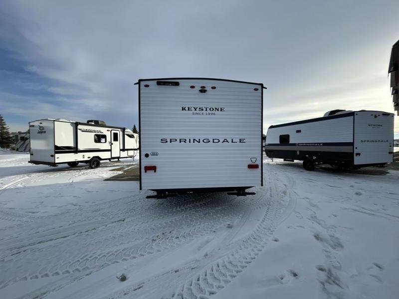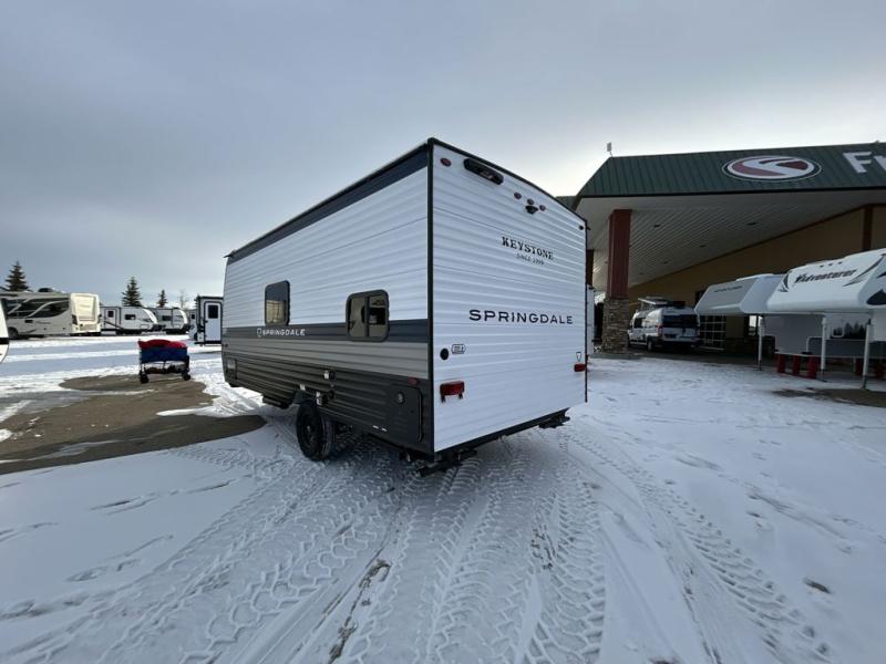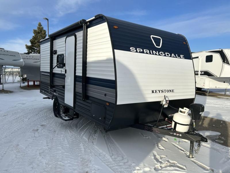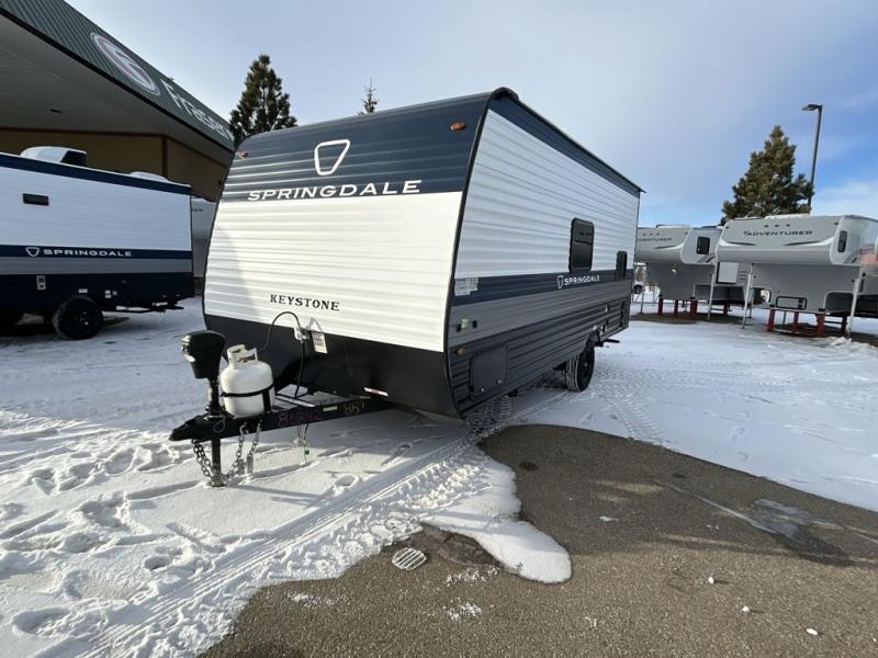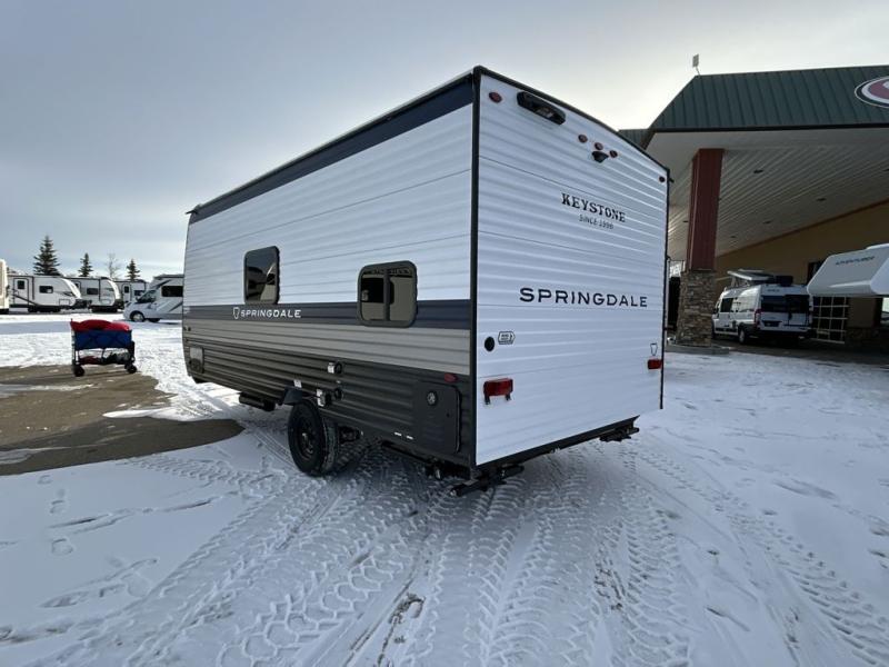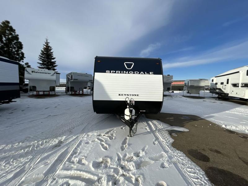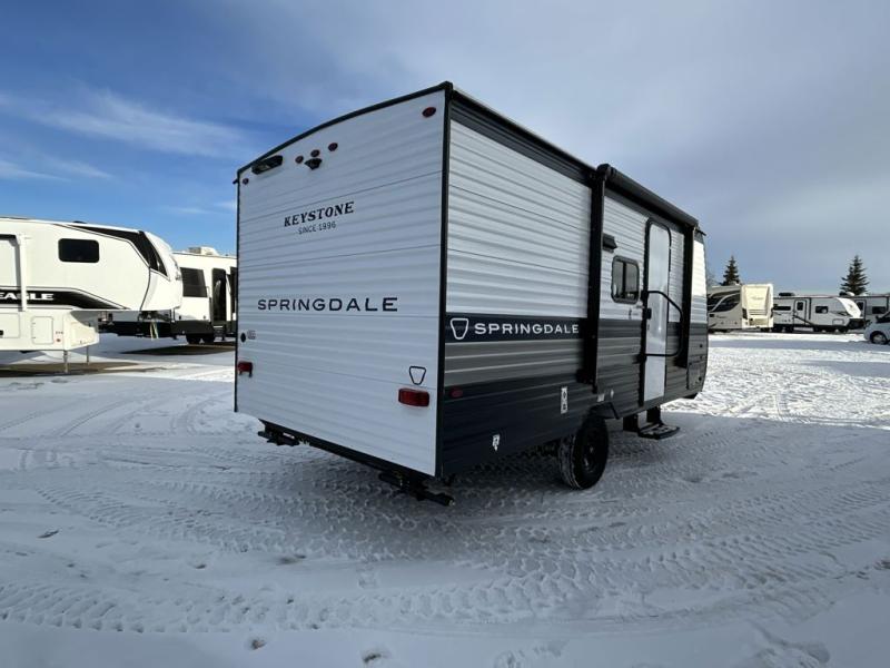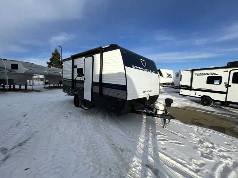 With any Springdale Mini travel trailer by Keystone, you will enjoy lightweight towing thanks to their single axle! The XL tinted safety glass windows are ultra durable, and the power awning will provide protection from the sun as you relax in your camp chairs outside. Each model includes blackout night shades, LED lighting, plus many more interior comforts. There is also a 20K BTU furnace to keep you comfortable, plus a tankless water heater for endless hot showers!