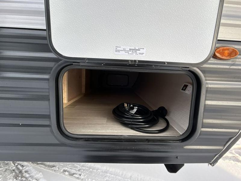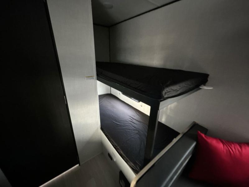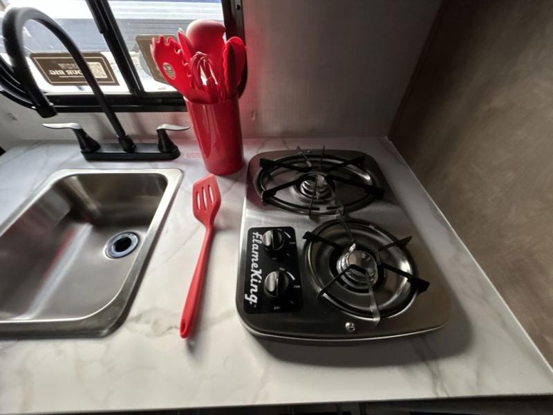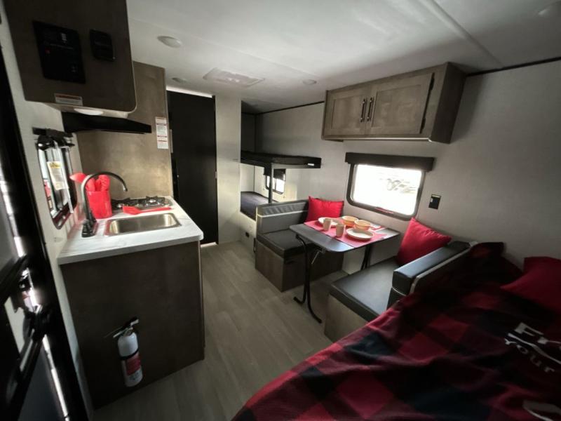 This travel trailer with rear corner bunk beds is sure to be a hit at the campground! While your guests or little ones take the bunks, you can enjoy the front Olympic RV queen bed to yourselves. There is even storage under the bed, an overhead shelf, and a wardrobe for your things. The chef of your group can whip up meals on the two-burner cooktop or in the microwave oven, and there is a 3.3 cu. ft. 12V refrigerator to keep food fresh. A booth dinette provides a place to dine together, or you can take your plate outdoors to sit under the 8' power awning with LED lights!