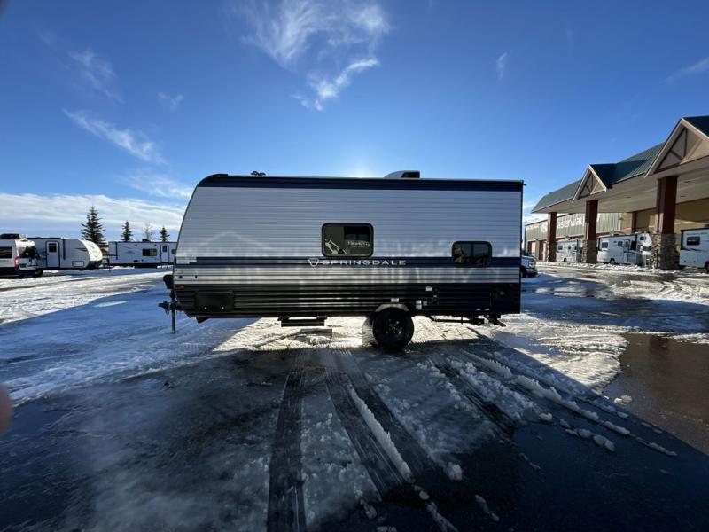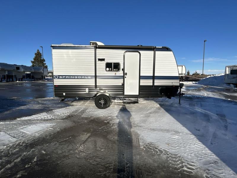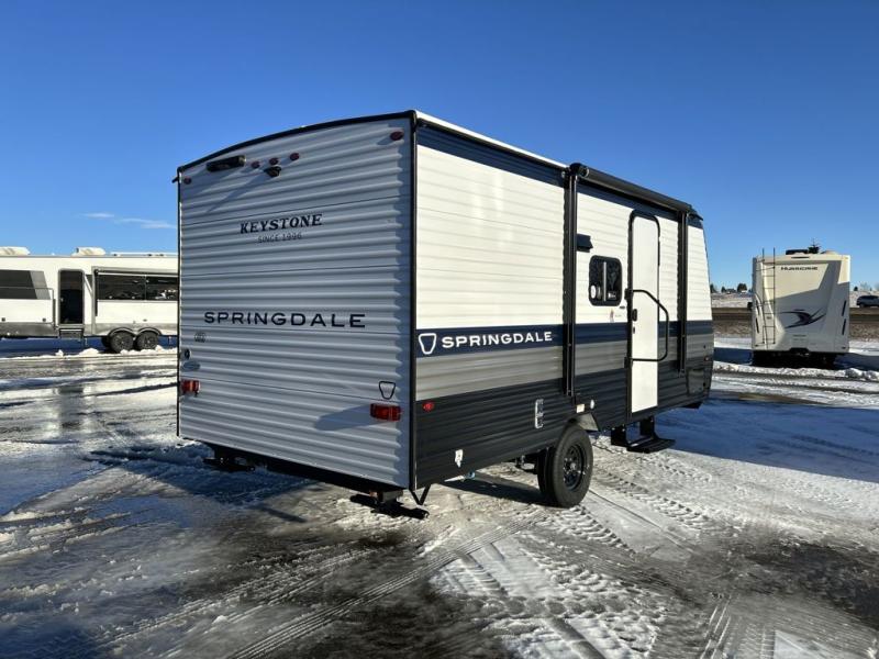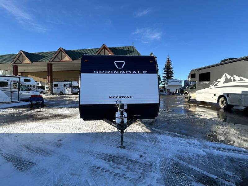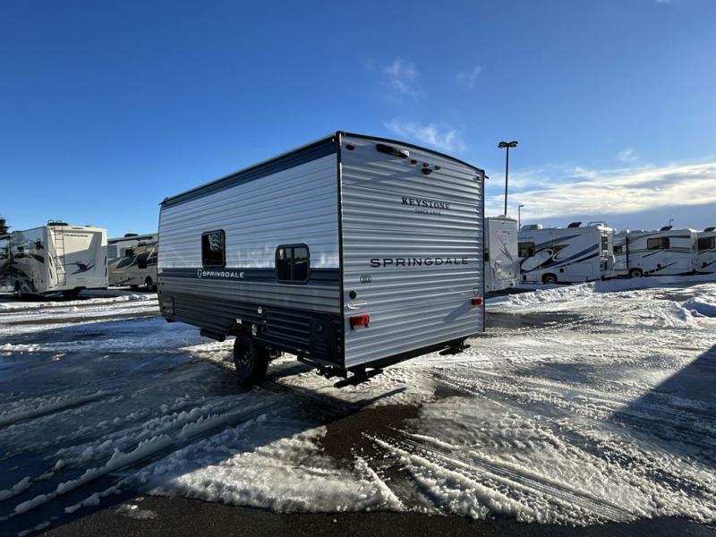 With any Springdale Mini travel trailer by Keystone, you will enjoy lightweight towing thanks to their single axle! The XL tinted safety glass windows are ultra durable, and the power awning will provide protection from the sun as you relax in your camp chairs outside. Each model includes blackout night shades, LED lighting, plus many more interior comforts. There is also a 20K BTU furnace to keep you comfortable, plus a tankless water heater for endless hot showers!