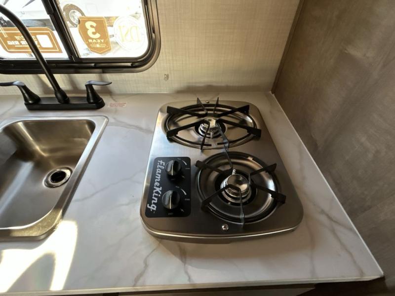 This travel trailer with rear corner bunk beds is sure to be a hit at the campground! While your guests or little ones take the bunks, you can enjoy the front Olympic RV queen bed to yourselves. There is even storage under the bed, an overhead shelf, and a wardrobe for your things. The chef of your group can whip up meals on the two-burner cooktop or in the microwave oven, and there is a 3.3 cu. ft. 12V refrigerator to keep food fresh. A booth dinette provides a place to dine together, or you can take your plate outdoors to sit under the 8' power awning with LED lights!