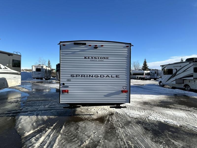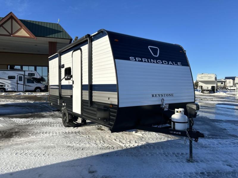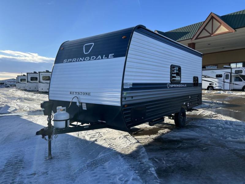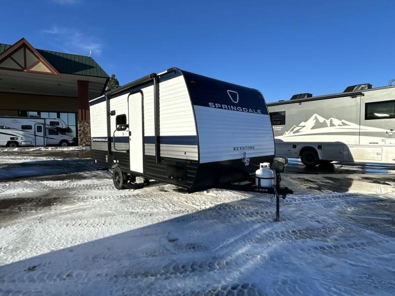 With any Springdale Mini travel trailer by Keystone, you will enjoy lightweight towing thanks to their single axle! The XL tinted safety glass windows are ultra durable, and the power awning will provide protection from the sun as you relax in your camp chairs outside. Each model includes blackout night shades, LED lighting, plus many more interior comforts. There is also a 20K BTU furnace to keep you comfortable, plus a tankless water heater for endless hot showers!