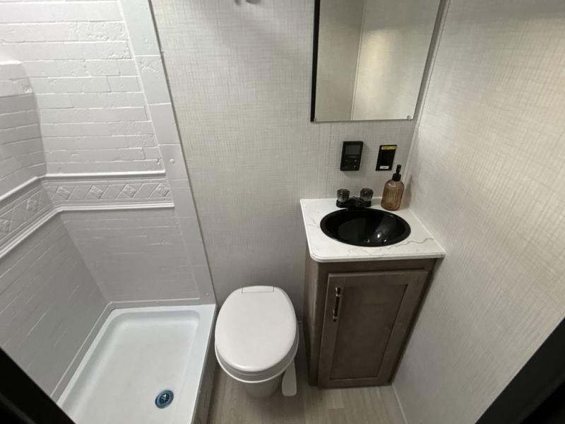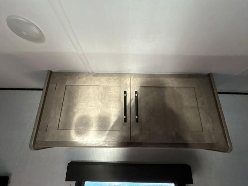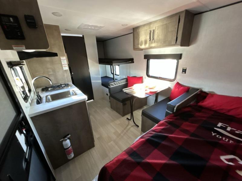 This travel trailer with rear corner bunk beds is sure to be a hit at the campground! While your guests or little ones take the bunks, you can enjoy the front Olympic RV queen bed to yourselves. There is even storage under the bed, an overhead shelf, and a wardrobe for your things. The chef of your group can whip up meals on the two-burner cooktop or in the microwave oven, and there is a 3.3 cu. ft. 12V refrigerator to keep food fresh. A booth dinette provides a place to dine together, or you can take your plate outdoors to sit under the 8' power awning with LED lights!