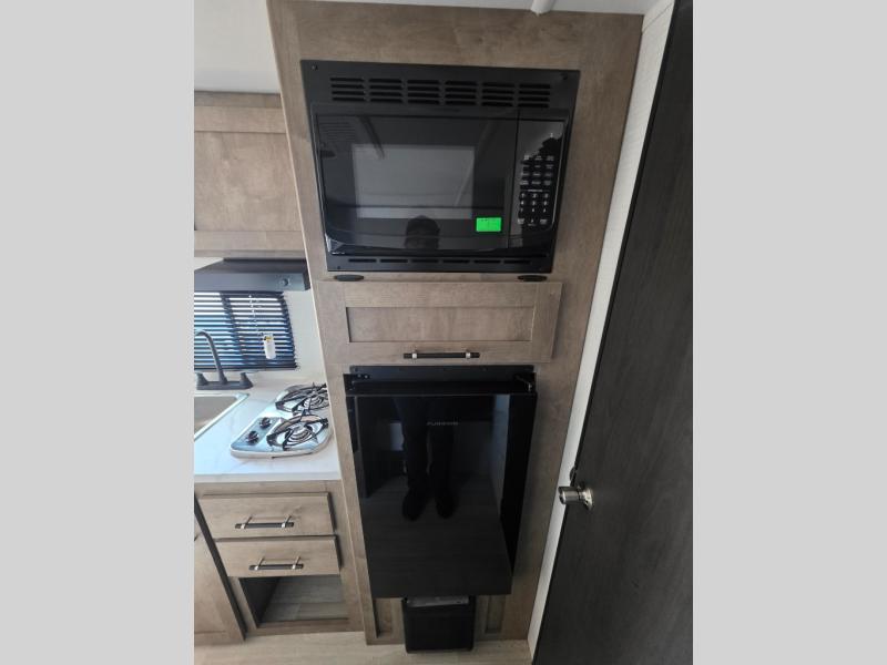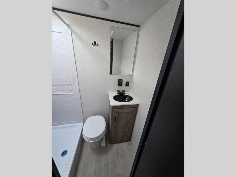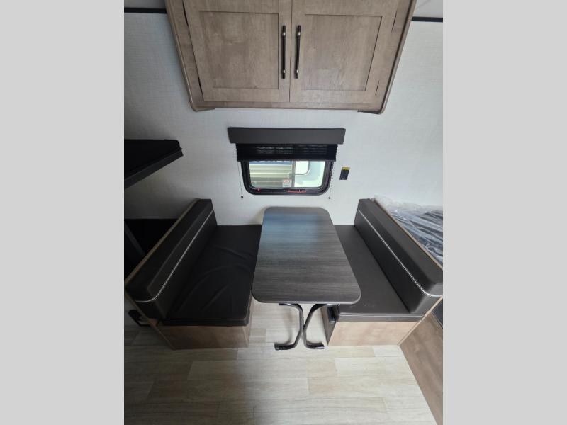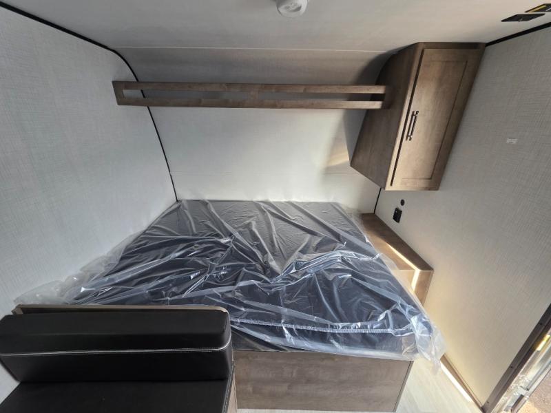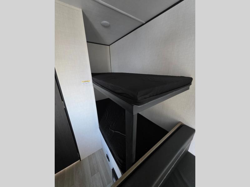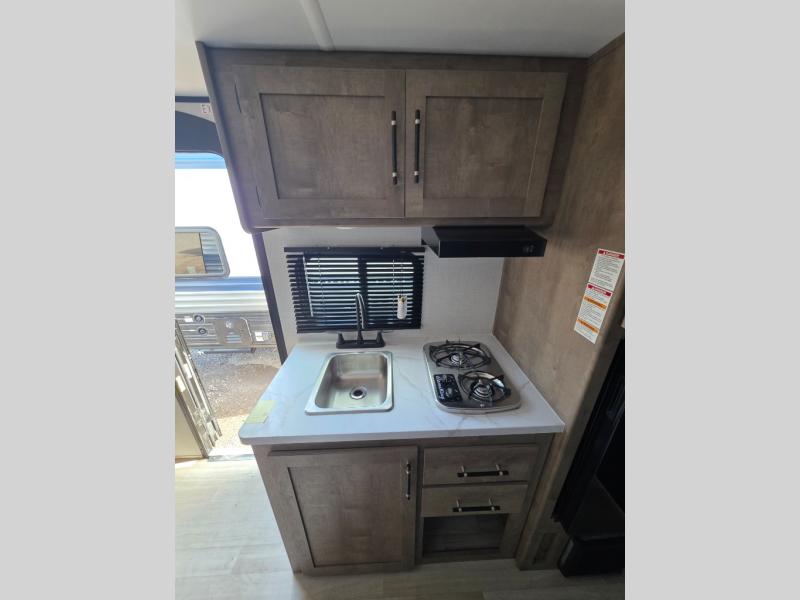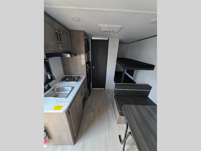 This travel trailer with rear corner bunk beds is sure to be a hit at the campground! While your guests or little ones take the bunks, you can enjoy the front Olympic RV queen bed to yourselves. There is even storage under the bed, an overhead shelf, and a wardrobe for your things. The chef of your group can whip up meals on the two-burner cooktop or in the microwave oven, and there is a 3.3 cu. ft. 12V refrigerator to keep food fresh. A booth dinette provides a place to dine together, or you can take your plate outdoors to sit under the 8' power awning with LED lights!