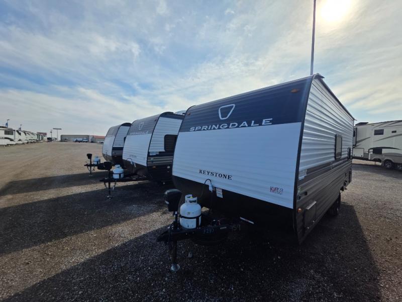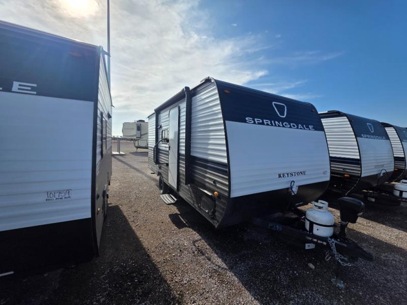 With any Springdale Mini travel trailer by Keystone, you will enjoy lightweight towing thanks to their single axle! The XL tinted safety glass windows are ultra durable, and the power awning will provide protection from the sun as you relax in your camp chairs outside. Each model includes blackout night shades, LED lighting, plus many more interior comforts. There is also a 20K BTU furnace to keep you comfortable, plus a tankless water heater for endless hot showers!