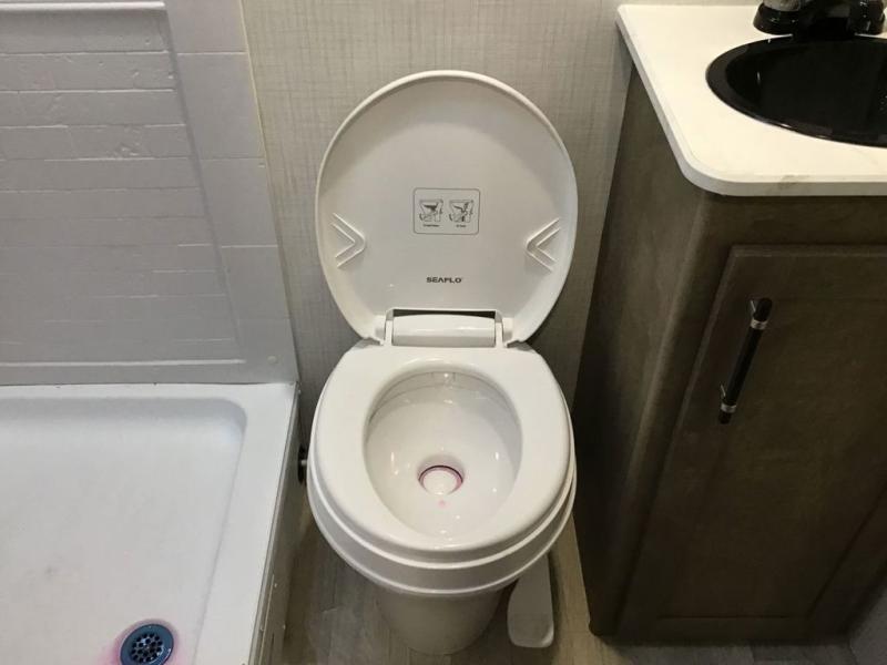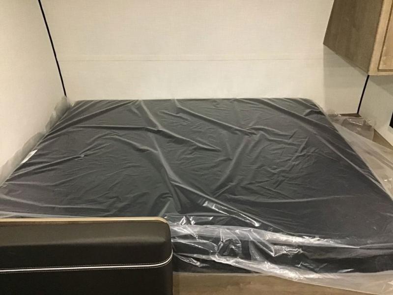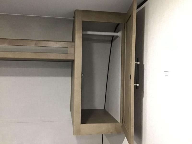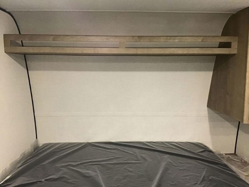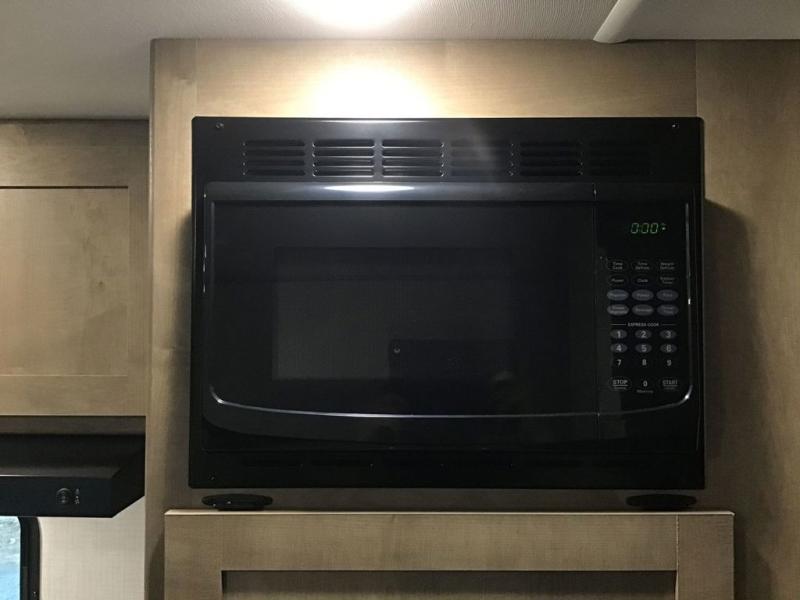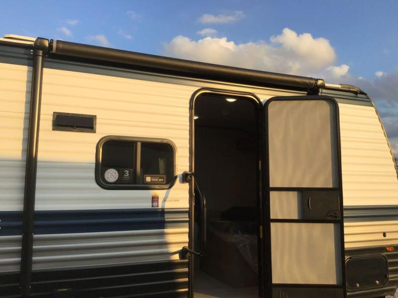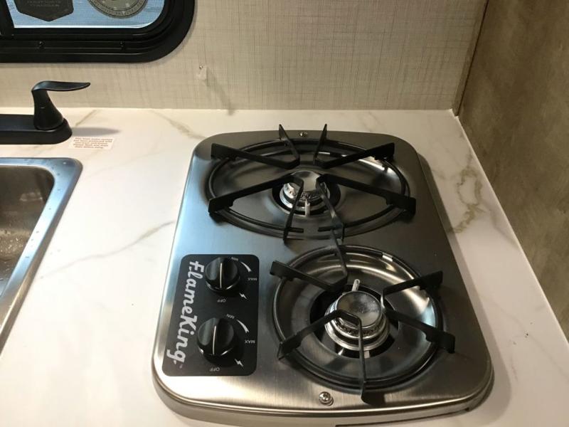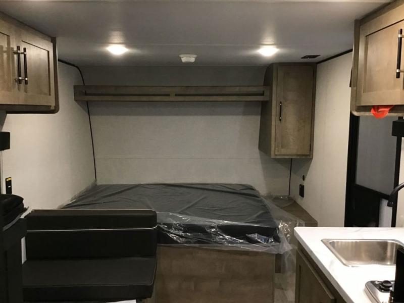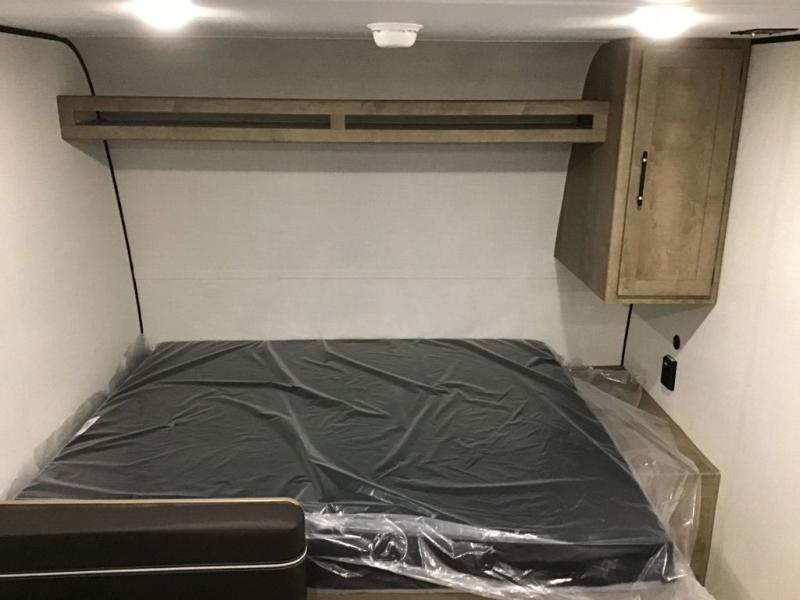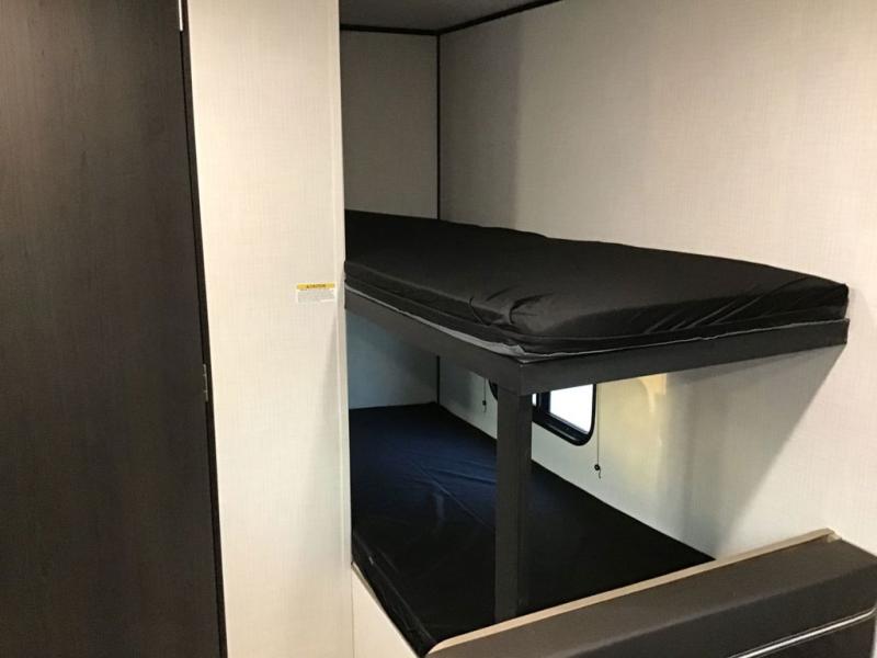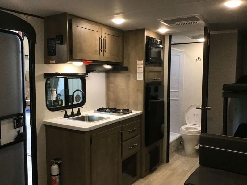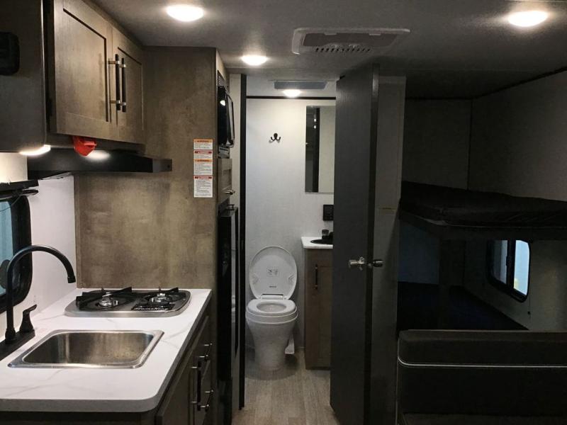 This travel trailer with rear corner bunk beds is sure to be a hit at the campground! While your guests or little ones take the bunks, you can enjoy the front Olympic RV queen bed to yourselves. There is even storage under the bed, an overhead shelf, and a wardrobe for your things. The chef of your group can whip up meals on the two-burner cooktop or in the microwave oven, and there is a 3.3 cu. ft. 12V refrigerator to keep food fresh. A booth dinette provides a place to dine together, or you can take your plate outdoors to sit under the 8' power awning with LED lights!