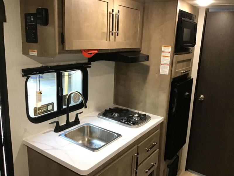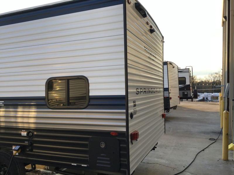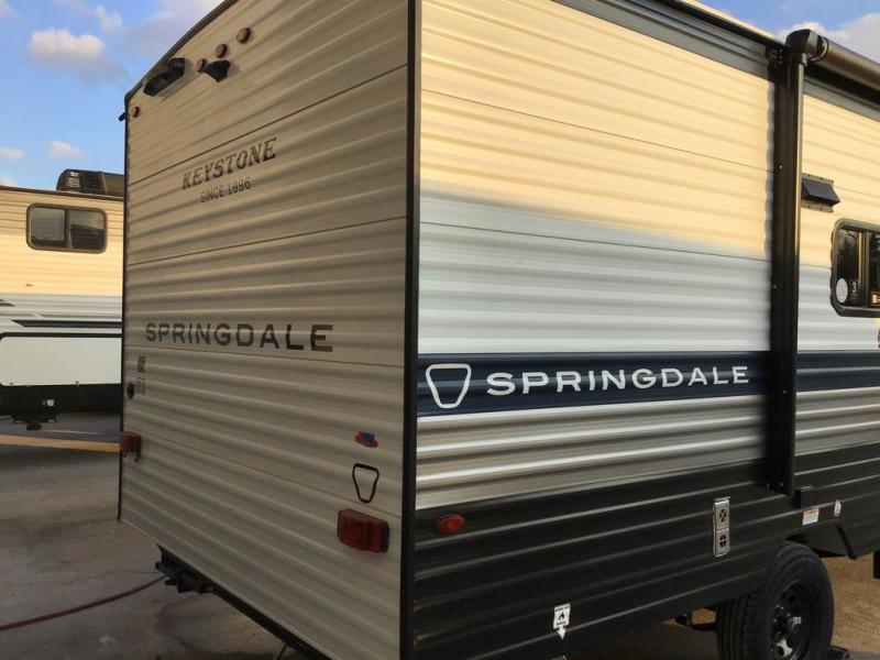 With any Springdale Mini travel trailer by Keystone, you will enjoy lightweight towing thanks to their single axle! The XL tinted safety glass windows are ultra durable, and the power awning will provide protection from the sun as you relax in your camp chairs outside. Each model includes blackout night shades, LED lighting, plus many more interior comforts. There is also a 20K BTU furnace to keep you comfortable, plus a tankless water heater for endless hot showers!