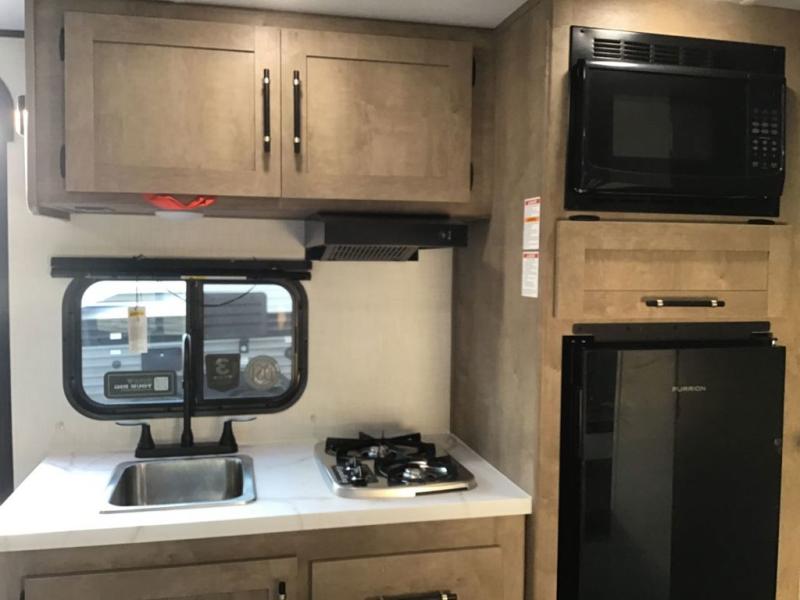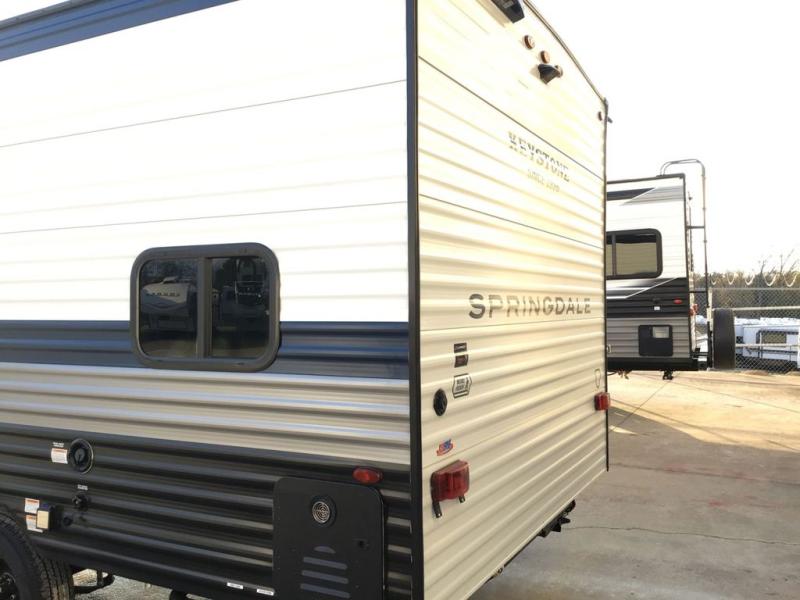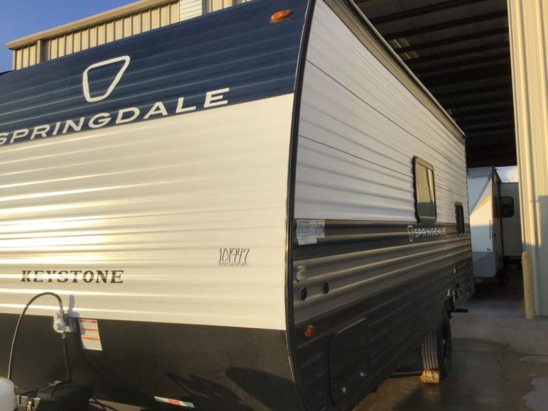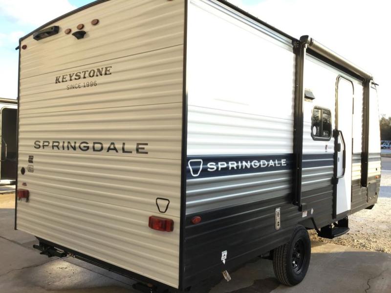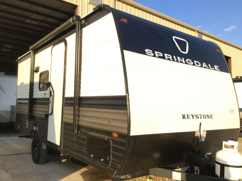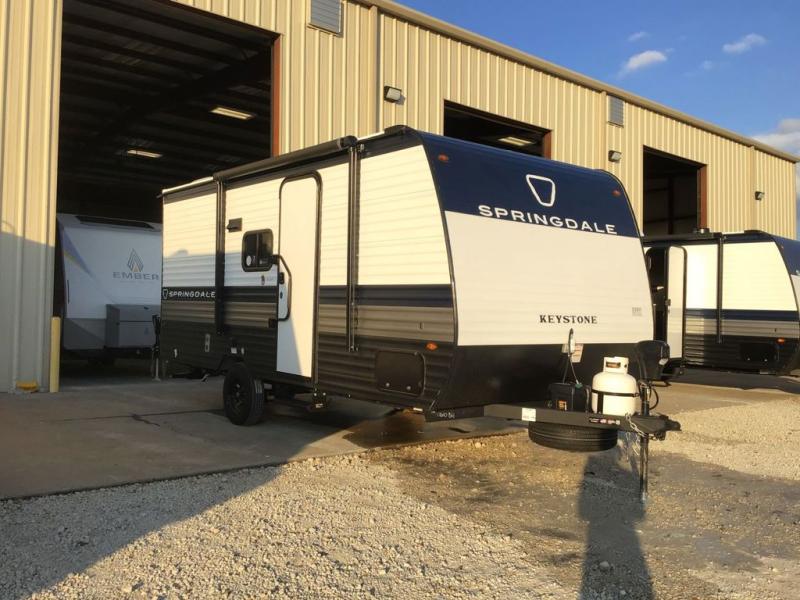 With any Springdale Mini travel trailer by Keystone, you will enjoy lightweight towing thanks to their single axle! The XL tinted safety glass windows are ultra durable, and the power awning will provide protection from the sun as you relax in your camp chairs outside. Each model includes blackout night shades, LED lighting, plus many more interior comforts. There is also a 20K BTU furnace to keep you comfortable, plus a tankless water heater for endless hot showers!