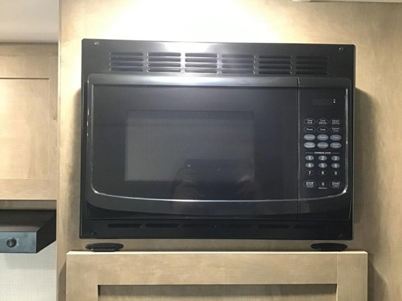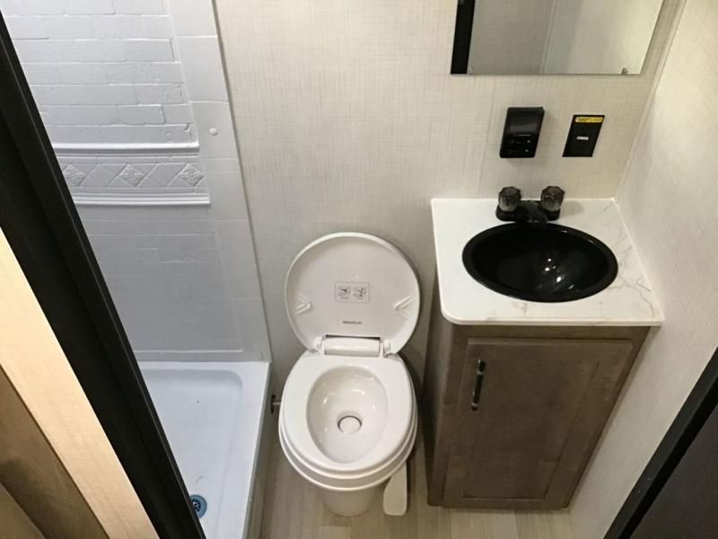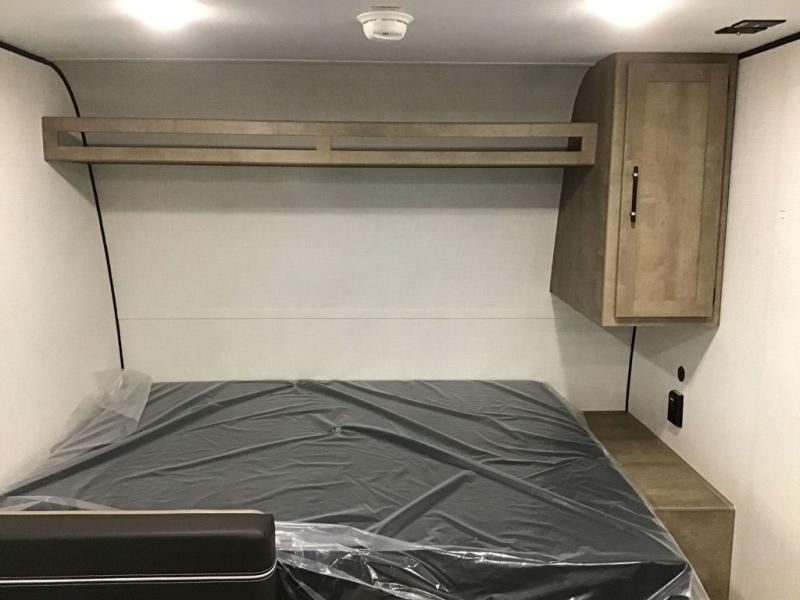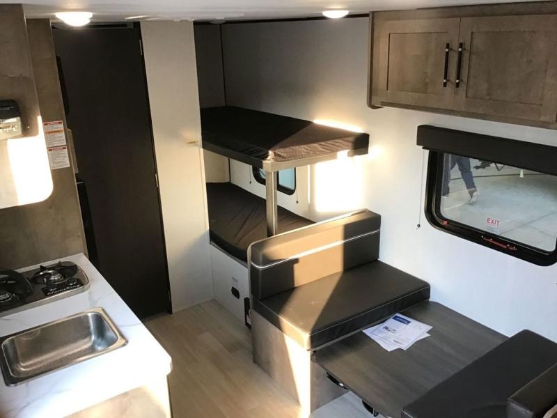 This travel trailer with rear corner bunk beds is sure to be a hit at the campground! While your guests or little ones take the bunks, you can enjoy the front Olympic RV queen bed to yourselves. There is even storage under the bed, an overhead shelf, and a wardrobe for your things. The chef of your group can whip up meals on the two-burner cooktop or in the microwave oven, and there is a 3.3 cu. ft. 12V refrigerator to keep food fresh. A booth dinette provides a place to dine together, or you can take your plate outdoors to sit under the 8' power awning with LED lights!