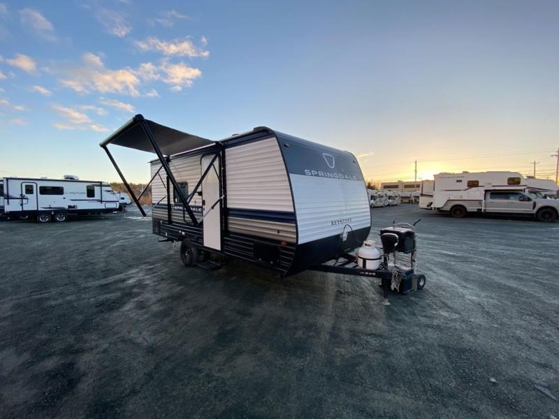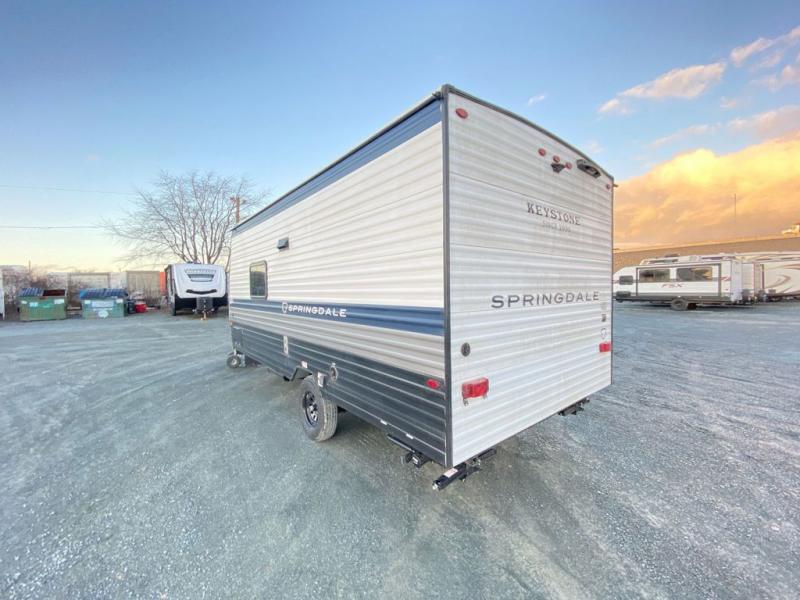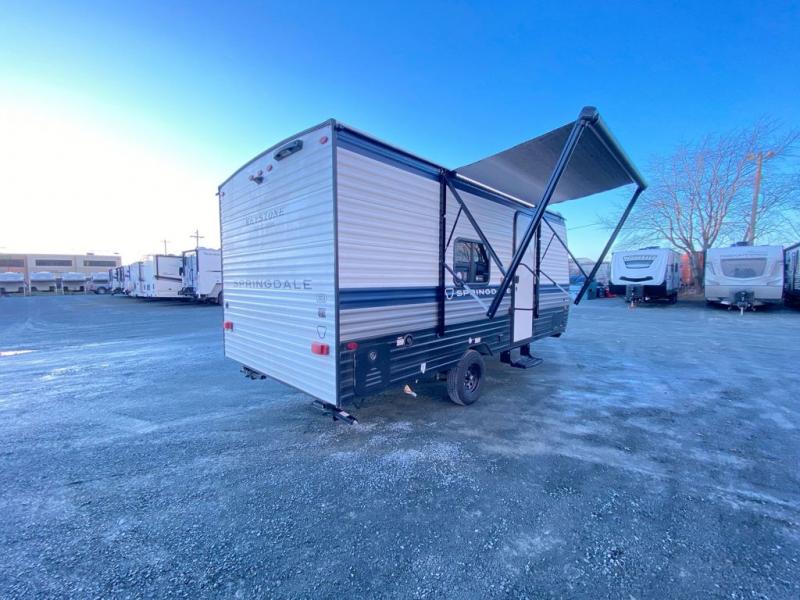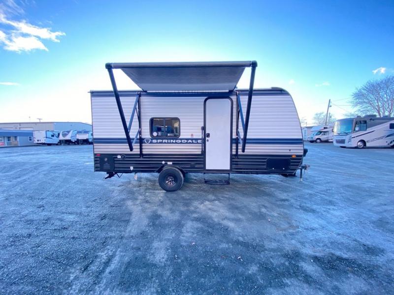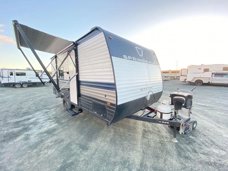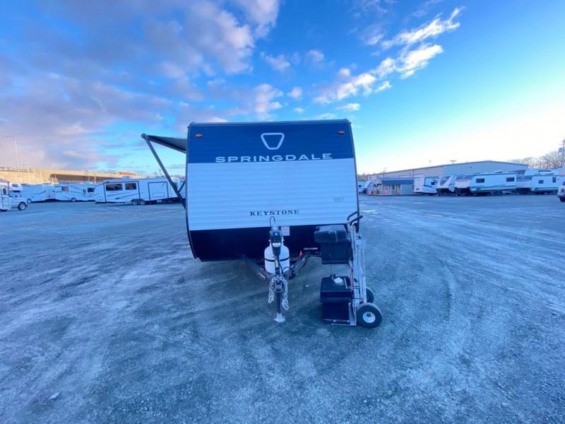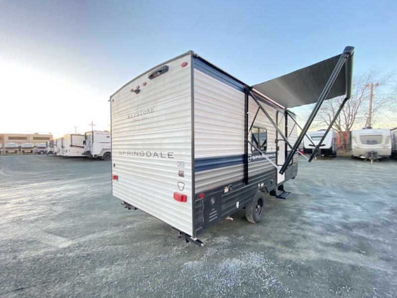 With any Springdale Mini travel trailer by Keystone, you will enjoy lightweight towing thanks to their single axle! The XL tinted safety glass windows are ultra durable, and the power awning will provide protection from the sun as you relax in your camp chairs outside. Each model includes blackout night shades, LED lighting, plus many more interior comforts. There is also a 20K BTU furnace to keep you comfortable, plus a tankless water heater for endless hot showers!
